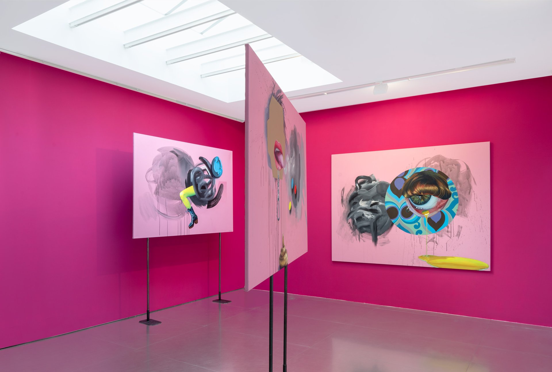 Proches de ceux exposés dans son installation cosignée avec Jakob Lena Knebl à la dernière Biennale de Venise, les nouveaux tableaux d’Ashley Hans Scheirl brillent par leur caractère énigmatique et provocant. Sur de grands fonds bleu azur ou rose, flottent quelques fragments de corps, quelques objets, ou même un étron imposant. À côté de ces représentations photo-réalistes, des barbouillages de gris, des éclaboussures, comme si deux langages, deux façons de lier la peinture au corps et à l’inconscient se faisaient entendre ensemble.