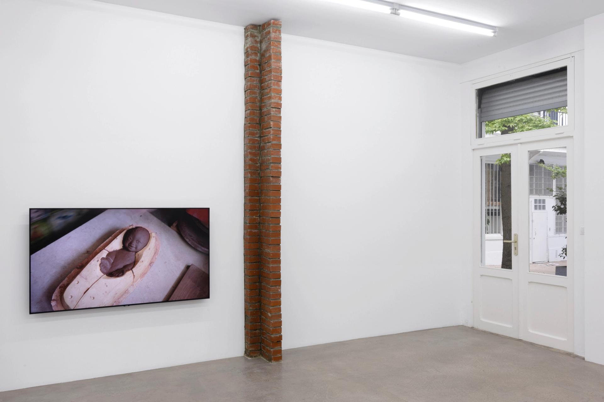 Cette exposition est pensée en deux parties par Sidsel Meineche Hansen, l’autre se tenant parallèlement à la Company Gallery à New York [15 septembre - 28 octobre 2023]. Dans les deux, on trouve une série de Hooks, des pièces en acier ou en bronze, de différentes tailles, forgées ou moulées sur le modèle d’anciens doubles crochets à viande. Dans les deux est projeté Baby Jesus (2023), sur une communauté de sœurs du sud de l’Angleterre, réalisé avec Therese Henningsen. À Paris, il y a aussi un mur, ou plutôt un retour en mur, fait de briques posées par l’artiste (de la série Home vs Owner) et qui équivaut à une prise de possession de l’espace.