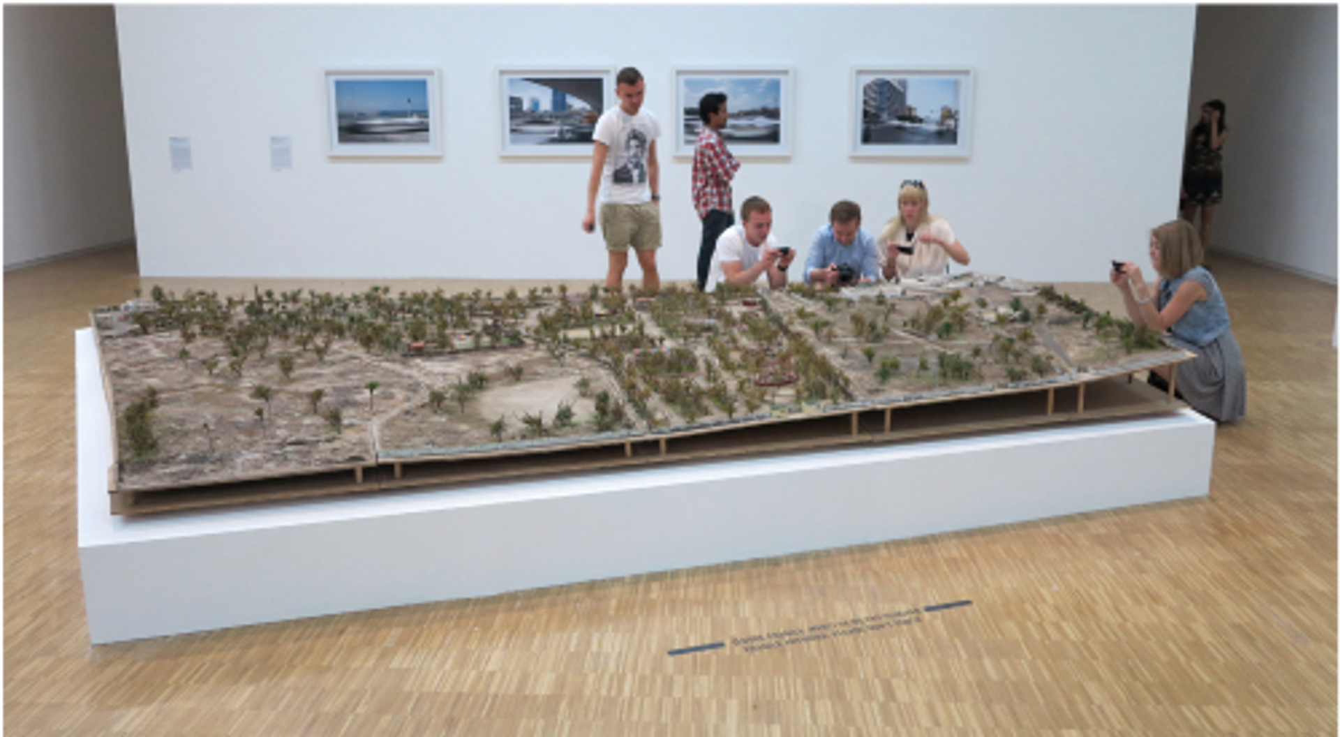 Vue de l’exposition « Une histoire » avec Le Projet de la maquette de Hassan Darsi, 2002-2003, 14 éléments, techniques mixtes (maquette au 1/100e du parc de l’Hermitage à Casablanca dans son état de l’année 2001), Paris, Centre Pompidou, 2014-2016. Courtesy du Centre Pompidou