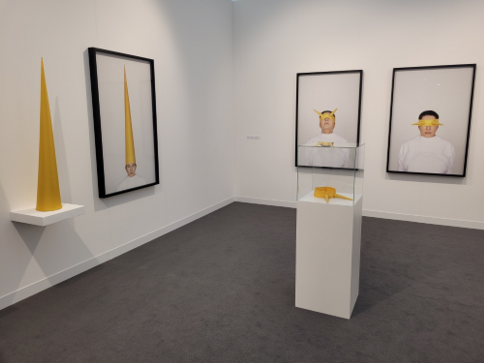 Plusieurs artistes à l’affiche des institutions londoniennes sont naturellement en vedette sur les stands. Hôte de la Royal Academy, Marina Abramovic est présente entre autres chez Krinzinger, avec des pièces allant de 20 000 à 150 000 euros, sur sa célèbre série des Energy Hats des années 2000. Alors que la Tate Modern organise enfin l’exposition de Philip Guston, Hauser and Wirth, cette fois à Frieze Masters, propose notamment une de ses peintures, de 1977. Enfin, El Anatsui, dont des œuvres monumentales ornent la Turbine Hall de l’institution, a suscité beaucoup d’intérêt sur le stand de la galerie Jack Shainman (prix entre 800 000 dollars et 2,2 millions de dollars). Pour la première fois, la galerie a migré de Frieze London à Frieze Masters. « Ici, on voit passer moins de célébrités, c’est un peu plus sérieux », note avec ironie l’enseigne. El Anatsui est également montré par la Goodman Gallery. Autre stand notable : celui d’Ai Weiwei présenté par la Galleria Continua (entre 80 000 et 300 000 euros, incluant ses travaux réalisés aux États-Unis). « Avec deux guerres en cours, nos attentes n’étaient pas bonnes, mais finalement le premier jour s’est bien déroulé, avec quelques ventes », confie la galerie.