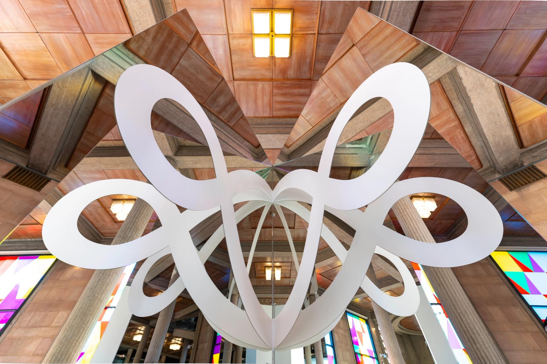 J’ai conçu cette exposition en regardant tout d’abord l’espace du Palais d'Iéna, une architecture à la fois récente et ancienne. J’ai revu un peu le parcours de ma recherche pour arriver à la formule de la création à travers le miroir. Je présente une œuvre qui montre comment je suis arrivé à comprendre le fonctionnement de l’univers depuis ses origines ! Il s’agit de deux miroirs totalement fermés, l’un contre l’autre. Il n’y a aucun espace physique entre les deux, et donc aucun reflet, ni de l’existence, ni du miroir lui-même. C’est, pourrait-on dire, le moment zéro. Dès lors, j’entre-ouvre légèrement cet espace, ce qui fait apparaître toutes les déclinaisons de miroirs possibles, jusqu’à l’ouverture totale. C’est un travail sur les possibilités de réflexion, une métaphore de ce qui se passe exactement dans l’univers à partir du Big Bang. L’univers est devenu de plus en plus étendu, nous sommes aujourd’hui à un certain point de cette ouverture. Pour donner corps à cette idée de la création perpétuelle, j’ai réalisé un symbole de trois cercles. Cette dynamique de trois, cette « trinamique », telle que je l’appelle, décrit ce processus. C’est un signe de la création qui se démultiplie. Cette idée remonte à 1973, mais la pièce a été refaite spécifiquement pour le Palais d’Iéna.