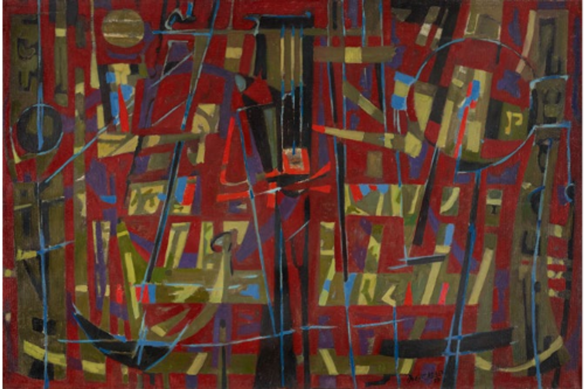 Jean Bertholle, Instruments de la Passion, 1957, huile sur toile, 97 × 145,8 cm. © Crédit photographique : Fondation Gandur pour l’Art, Genève. Photographe : Sandra Pointet