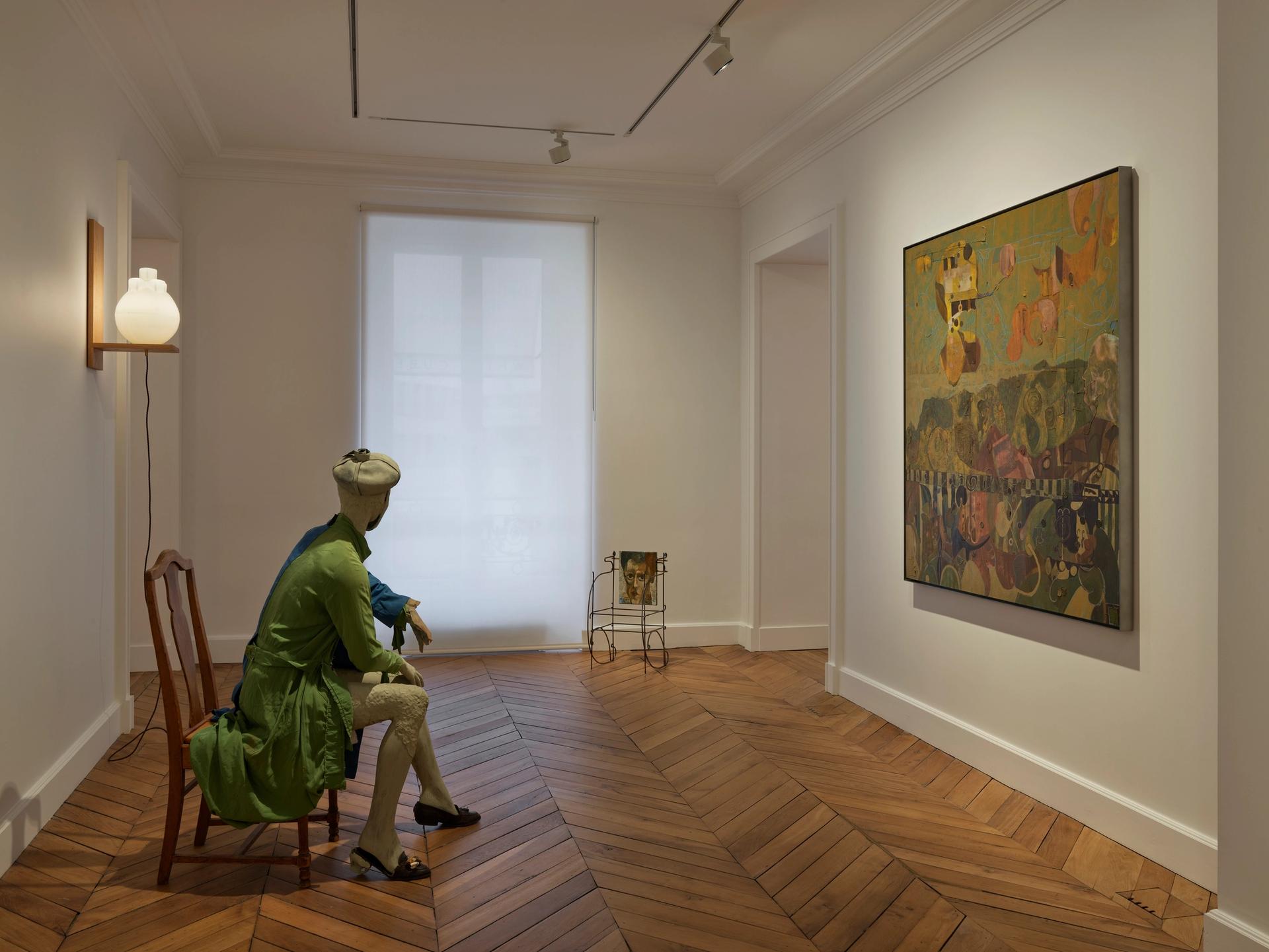 Les grands tableaux présentent différentes scènes allant du spectacle de théâtre à la rencontre amoureuse en passant par le dîner de famille, en mêlant le style artiste, vif et esquissé, et parfois des compositions de type art construit. Les motifs en brocart se marient à des collages de restes de toiles. À côté des tableaux, on trouve sur des socles des chaussures éventrées laissant échapper des formations quasi organiques en différents matériaux. L’ensemble baigne dans un éclairage doux fourni par des globes inspirés du Bauhaus.
