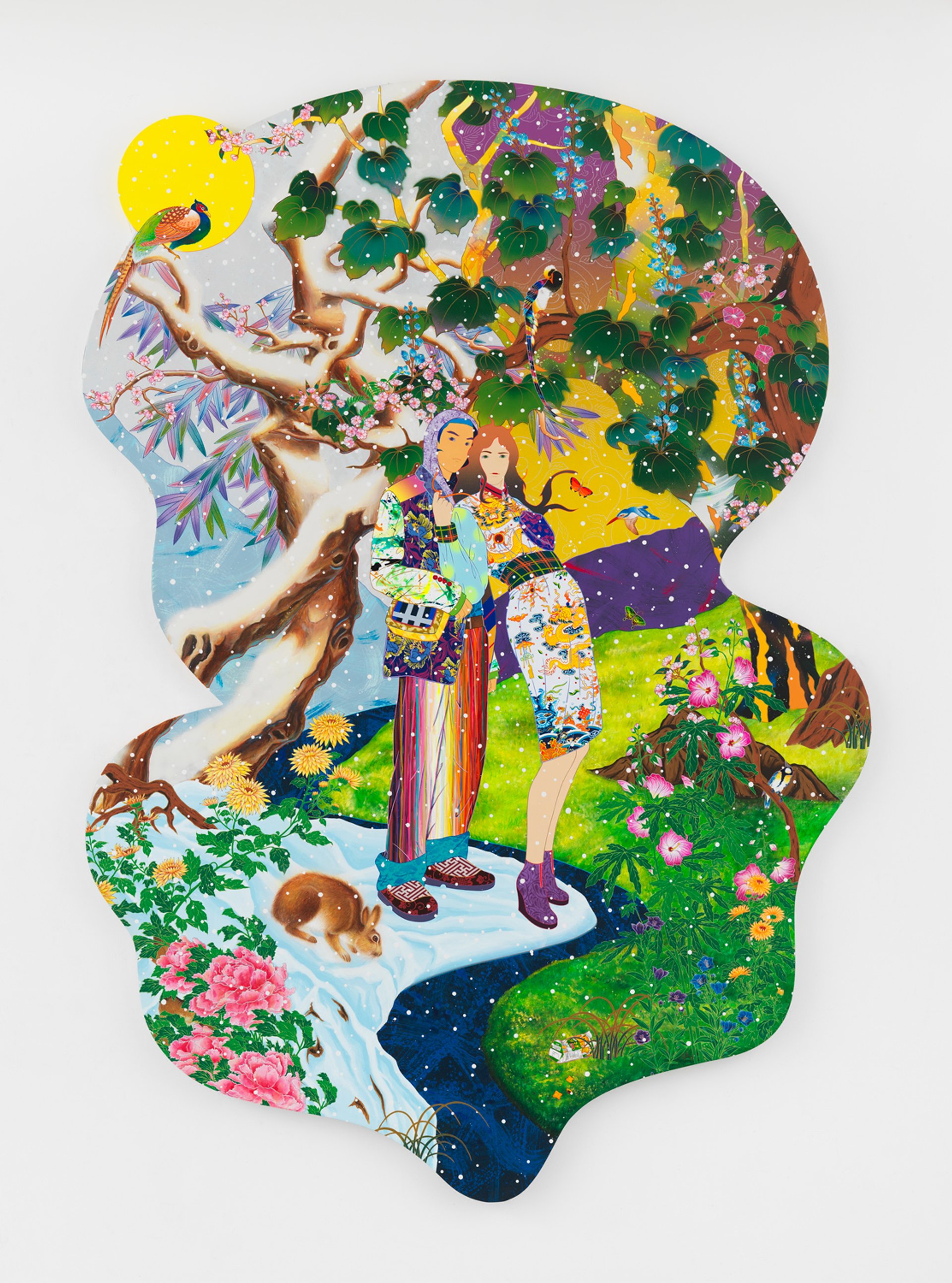 Plusieurs galeries participent en effet parce qu’elles représentent un ou plusieurs artistes du pays du Soleil levant. Kotaro Nukaga (Tokyo) a invité Almine Rech car les deux galeries représentent l’artiste japonais Tomokazu Matsuyama. Lors du vernissage, elles ont vendu conjointement son tableau Blue Monday Frost (2023), pour 260 000 dollars. Représentant un jeune couple à la mode dans un paysage parsemé de flocons de neige et rempli de fleurs printanières, cette œuvre associe des références à la période Edo du Japon et à l’expressionnisme abstrait, selon Kotaro Nukaga. « Son travail est comme un carrefour entre la haute et la basse culture, l’ancien et le nouveau, les produits de base et les marques de luxe », explique le marchand japonais. Thibault Geffrin, directeur de la galerie Almine Rech à Londres, explique que Tomokazu Matsuyama est à l’origine de la collaboration entre les deux galeries : « Lors de son exposition à notre espace londonien en début d’année, l’artiste nous a mis en contact [avec Kotaro Nukaga] ». Tomokazu Matsuyama présente également une exposition personnelle au Musée d'art contemporain de Hirosaki, dans la ville japonaise d’Aomori, jusqu’au 17 mars 2024.