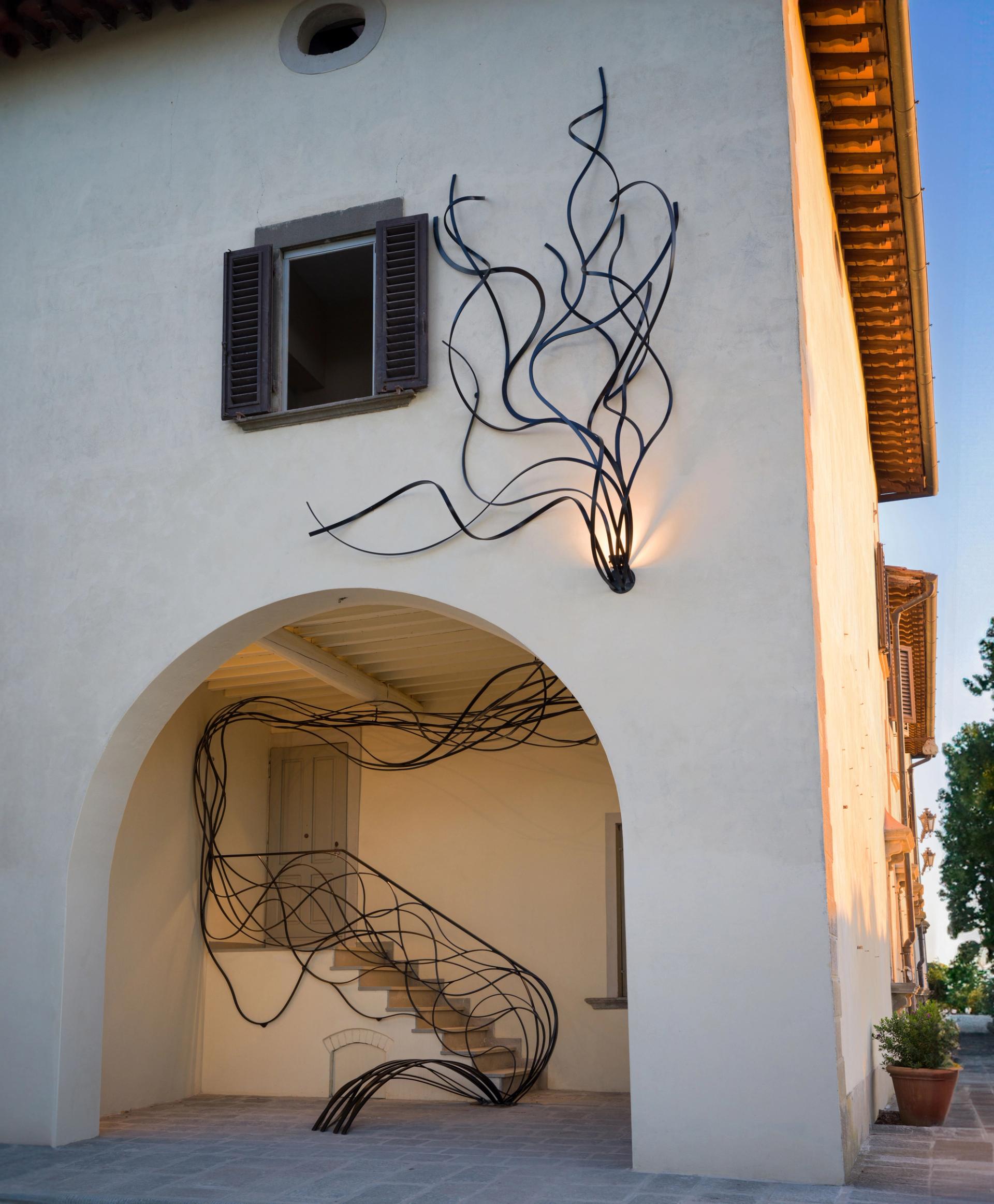 Invité à concevoir plusieurs pièces in situ, dont un escalier dans la loggia et une série de sièges tout aussi spectaculaires, I Trespoli Toscani, dont les hauts dossiers oscillent au gré du vent sur un belvédère de verdure, l’expert ès arabesques a installé près de la piscine et dans les jardins le mobilier-sculpture qui a fait sa réputation, dont Ma Bulle et Le Banc du Château, déclinaison de son fameux « banc spaghetti », au design plus al dente que « style nouille ».