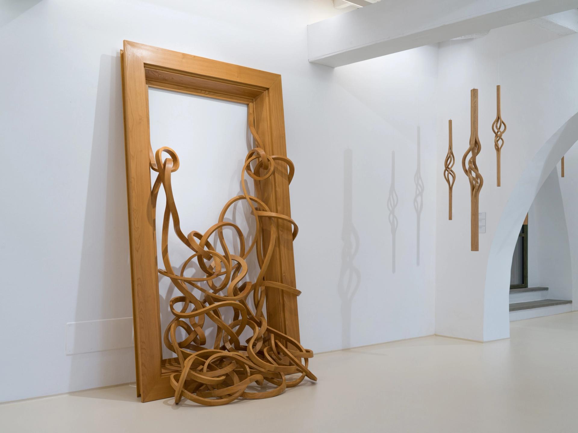 Dans La Tinaia, l’ancien pressoir de la propriété viticole converti en espace d’exposition dédié à l’art contemporain – lequel a précédemment accueilli des œuvres d’Ólafur Elíasson –, Pablo Reinoso montre plusieurs séries de pièces en bois, où la virtuosité le dispute à l’humour. Par exemple, ces cadres sculptés dont les bords dégoulinent et s’enchevêtrent. « Mes cadres ne sont pas des cadres, ils sont des hors-sujets, ou hors-propos. Des hors-cadres, tout en gardant l’aspect de cadres. Des sorties de route », poétise-t-il.