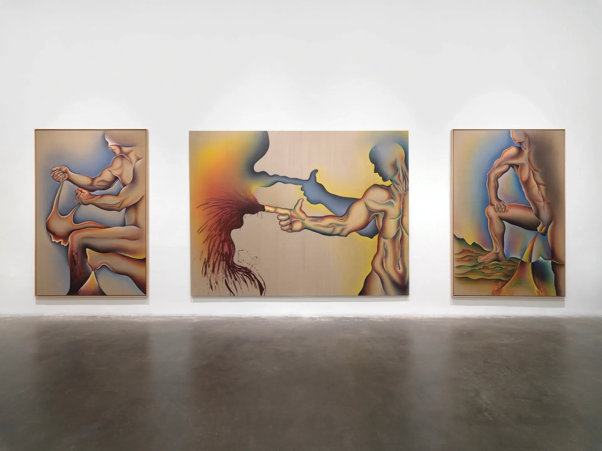 Vue de l'exposition « Judy Chicago : Herstory » au New Museum à New York. De gauche à droite : Crippled by the Need to Control/Blind Individuality (1983), In the Shadow of the Handgun (1983) et Pissing on Nature (1984). Courtesy New Museum. Photo : Dario Lasagni
