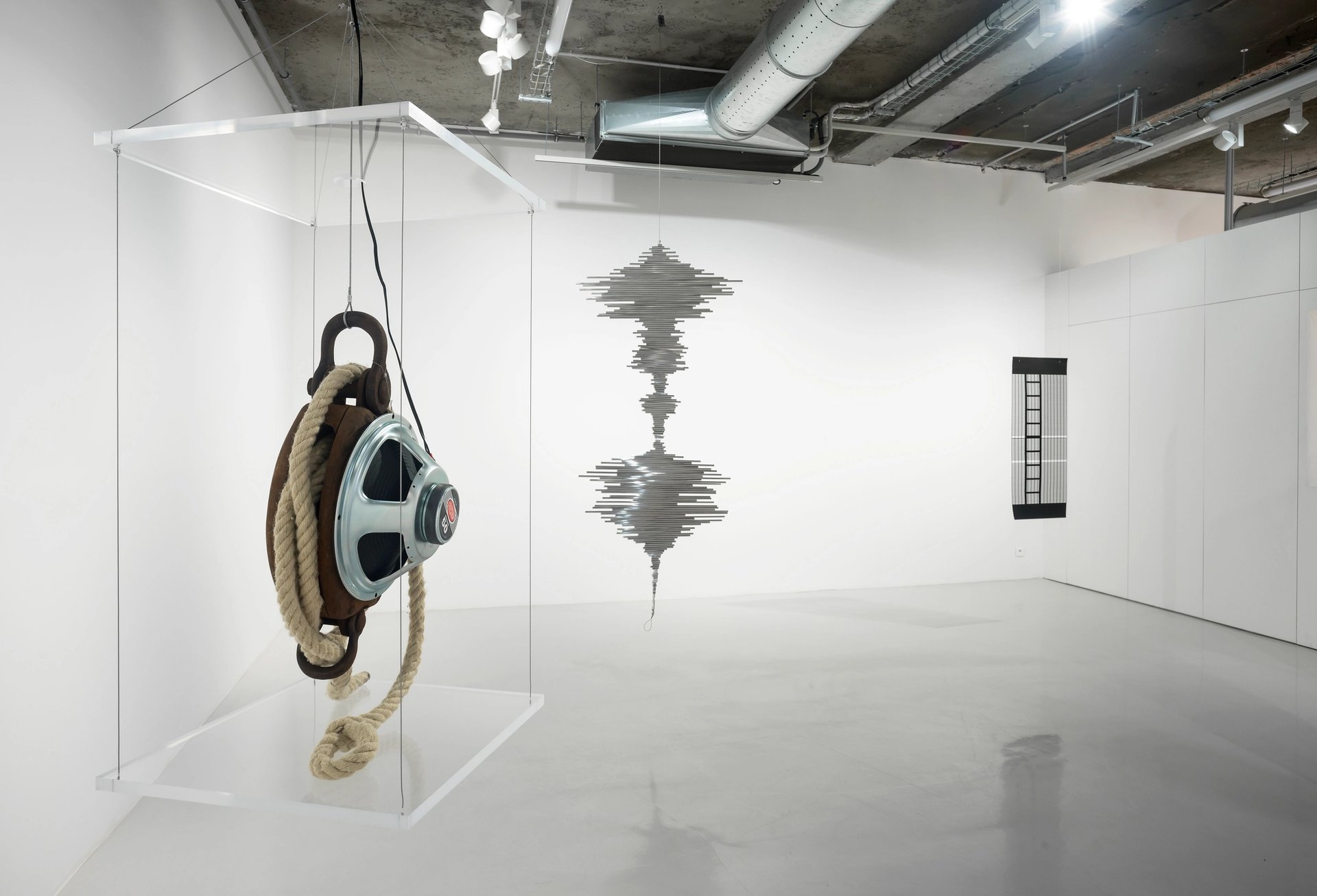 Au-delà des différences dans la manière dont chacun peut ou a pu avoir recours à la suspension (surprise de découvrir un mobile en bois léger de Miriam Cahn), celle-ci a certainement une force symbolique. Par elle, l’œuvre peut affirmer sa présence, se voir ailleurs dans l’espace ou le temps et croire suspendre avec elle certaines apories de l’avant-garde. Significative est à cet égard cette pièce de 1964 de William Anastasi, une poulie qui diffuse le bruit d’un de ses usages et qui semble répondre à une célébrissime œuvre de Robert Morris : une invitation à sortir de la boîte. Les rubans de textes disséminés par Zbyněk Baladrán entre images et pièces d’argile minent l’autorité de formules ou de slogans libertaires. Quant à Diego Bianchi, il semble avec ses feuilles de plastique végétal suspendues sur le fil à linge vouloir attirer l’ombre d’Eva Hesse dans son quotidien.