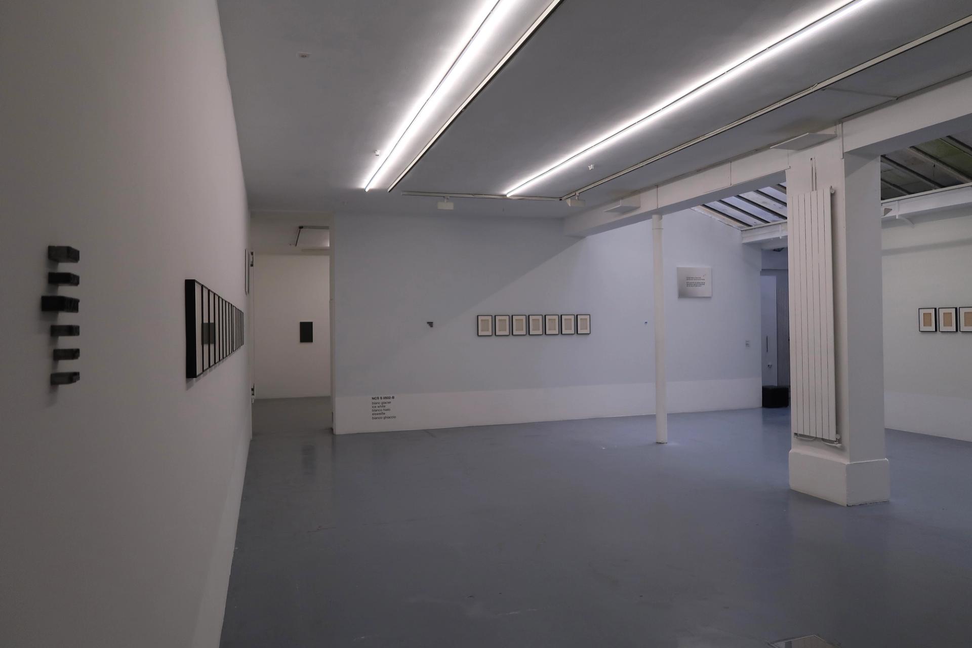 Dans la première salle, chacun des murs est dans sa partie basse recouverte d’une large bande d’un blanc pur distinct dont le nom et la référence sont donnés en lettres noires : os, pierre, nuage… On tente de saisir les imperceptibles différences entre ces blancs tandis que leurs dénominations nous envahissent d’images. Sur les murs, on voit encadrées des pages de livres portant le numéro de chapitres qui commencent au verso. On voit aussi des combinaisons de mots en lettres de plomb inversées, des godets et, à des hauteurs diverses, des photographies noir et blanc de signalétiques de musées : des flèches signalant la suite d’une exposition. Condensés de mémoires pour l’artiste et espaces très largement ouverts pour l’imagination du spectateur.