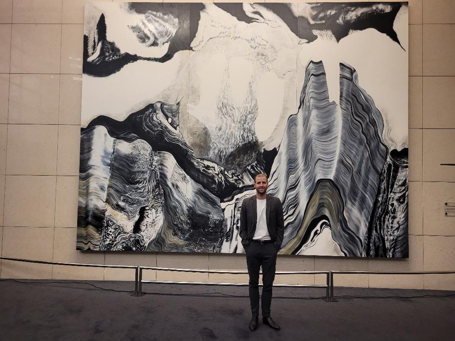 Très lourde, l’œuvre a nécessité une mise en place complexe, en plusieurs parties. Elle remplace une pièce de Jean Paul Riopelle. Cette commande prestigieuse « porte en elle le récit de l’émergence d’un monde, par le mouvement. Il s’agit d’un opera pictural, au sens latin du terme. C’est en faisant de la peinture un art vivant que l’expressionnisme abstrait pourra se renouveler à l’avenir », confie l’artiste, qui souhaite ainsi « rapprocher davantage la peinture des arts du spectacle ».