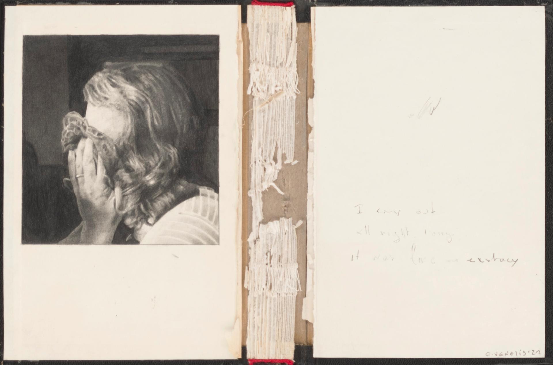 Christos Venetis, Sans titre, 2022, crayon sur couverture de livre, 21 x 31,5 cm. Courtesy Galerie Martin Kudlek. Collection Florence et Daniel Guerlain