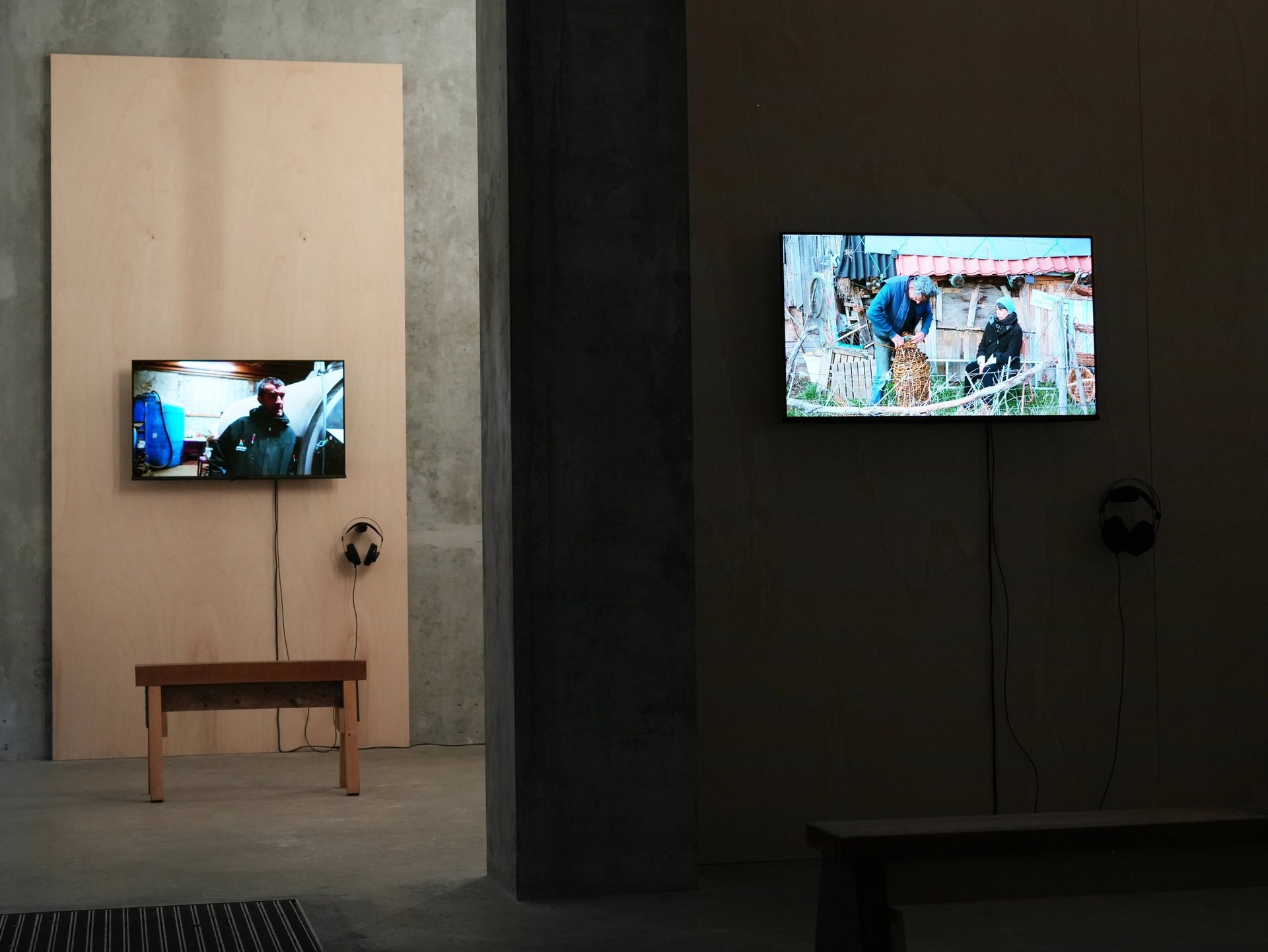 Cette exposition est la première de Jean-Baptiste Perret, cinéaste remarqué dans les circuits du cinéma documentaire. Il présente trois films brefs qui tournent ensemble dans une même salle et, dans une autre, un court-métrage de type enquête. Les trois films – L’Arrivée au refuge, La Cueillette de l’Osier et La Nasse – montrent des actions ou des activités (l’un fait entendre un peu de conversations) exercées par des individus ayant choisi de vivre à l’écart, quelque part en Haute-Loire. Ils se sont construit « un espace rien qu’à eux » et c’est avec un sens manifeste du cadre que Jean-Baptiste Perret les saisit dans leur décor. Portraits-paysages entrevus dans le respect d’un certain secret. L’œil navigue de l’un à l’autre et trouve à les accorder.