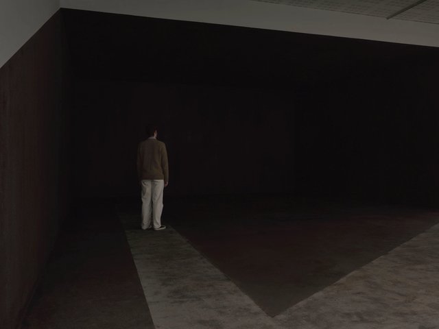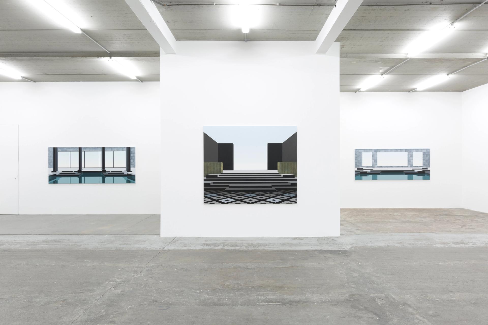 Henrik Samuelsson a peint cette série de tableaux durant les confinements successifs imposés en Suède en 2020. Le titre de « Refugium » attribué à cinq d’entre eux souligne le sentiment général. Ce sont des vues d’architectures sans présence humaine visible, toutes symétriques, tracées au tire-ligne. On croit reconnaître dans certaines des façades de locaux commerciaux ou d’espaces d’activités, des intérieurs de bureau, dans d’autres les colonnes ou les murs d’édifices imposants, bâtiment public, temple ou piazza (cela importe peu, il s’agit de constructions imaginaires, des archétypes) qui ouvrent sur une zone de clarté. Les tonalités sont grises et brunes. Les toiles sont accrochées bas de manière à s’adresser au corps autant qu’au regard et l’effet d’ensemble joue à plein dans le large espace aveugle qui les accueille. Certaines vues de façade semblent même avoir été inspirées par la paroi vitrée délimitant le bureau de la galerie.