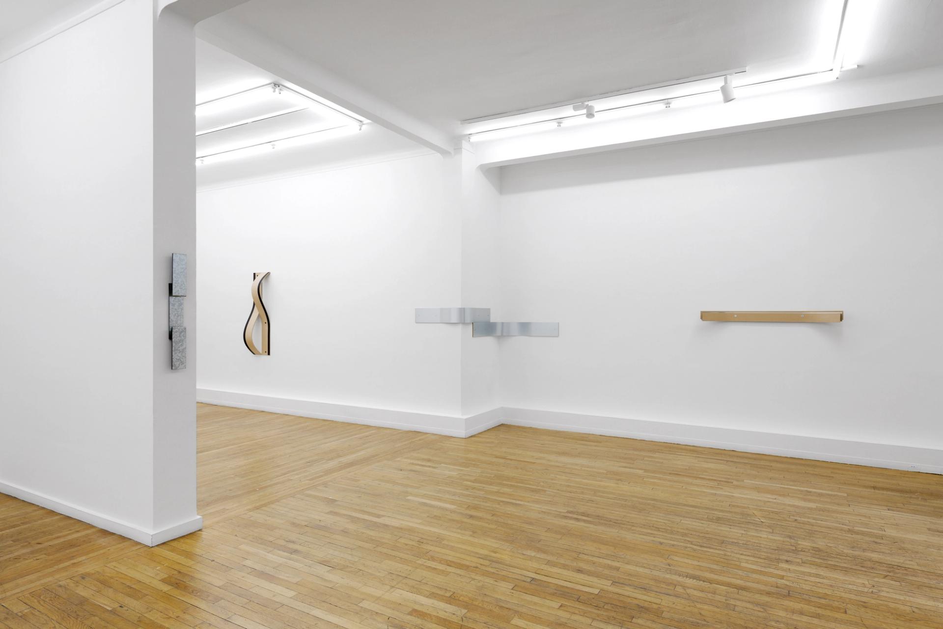 Sculptrice plutôt qu’artiste conceptuelle comme le laconisme de ses sculptures murales pourraient le laisser croire, Lesley Foxcroft travaille avec l’architecture des lieux en usant de matériaux sans éclat : MDF, métal, caoutchouc et visserie ordinaire. Certaines de ses œuvres sont si discrètes, si ténues qu’elles pourraient passer pour des parties d’équipements si leur positionnement précisément déterminé et les espacements entre elles ne les déclarait objets d’attention. La pliure d’une mince plaque de métal, la torsion de deux bandes de MDF bordées d’un adhésif noir s’imposent à nous comme dessins et gestes de sculpture. Dans une vision d’ensemble, ces objets opèrent comme des marqueurs visuels, des signes de ponctuation d’une longue ligne virtuelle à hauteur d’œil. Quatre pièces ont été conçues spécialement pour l’exposition, sans qu’il nous soit dit lesquelles, mais on peut penser que figurent parmi elles les deux pièces d’angles qui soulignent de la plus simple façon l’articulation des murs. Au sein de cet espace dépouillé, une très longue ligne horizontale produit une intensification de l’expérience et crée comme un événement. Converge est constitué de deux séries de plaques rectangulaires qui se chevauchent et se rejoignent à l’angle de deux murs. Sur le mur de gauche, huit plaques de MDF avec une bande centrale en métal, et sur le mur de droite, six plaques en métal avec une bande centrale en MDF. Par la superposition des plaques qui ne fait apparaître qu’au point de convergence deux plaques dans leur totalité, par la symétrie inversée des motifs, l’œuvre dessine une ligne de vitesse au sein du parcours.