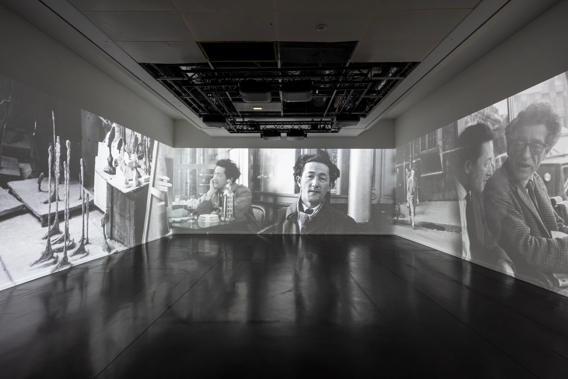 Le parcours, pensé avec la Fondation Giacometti, débute par l’évocation des liens entre le sculpteur et les existentialistes Simone de Beauvoir et Jean-Paul Sartre, qui publie en 1946 L’existentialisme est un humanisme. Dans des vitrines sont juxtaposées de petites sculptures et des exemplaires de la revue Les Temps Modernes sur lesquels l’artiste a réalisé des dessins.
