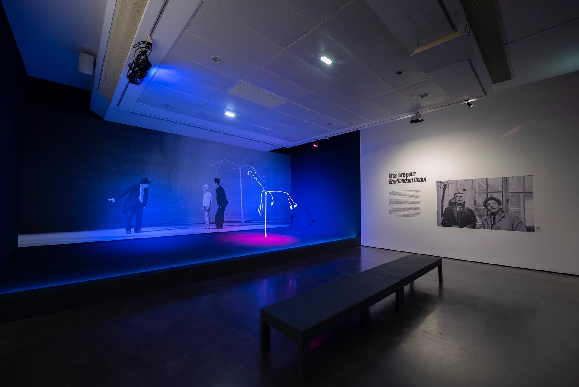 Plus loin, le visiteur se retrouve devant une scène de théâtre, celle de la pièce En attendant Godot de Samuel Beckett dans sa reprise au théâtre de l’Odéon à Paris en 1961. Pour ces représentations, Alberto Giacometti conçoit pour tout décor un arbre squelettique. Il en est présenté ici une reconstruction, accompagnée d’extraits sonores de la pièce. Cette salle trouve un écho dans le catalogue qui consacre un chapitre à la passion de l’artiste pour ce domaine. « L’intérêt de Giacometti pour le théâtre ne se situe […] pas dans l’illustration ou la recherche de motifs, mais interroge encore une fois sur l’articulation entre le réel et l’imaginaire », écrit Hugo Daniel.