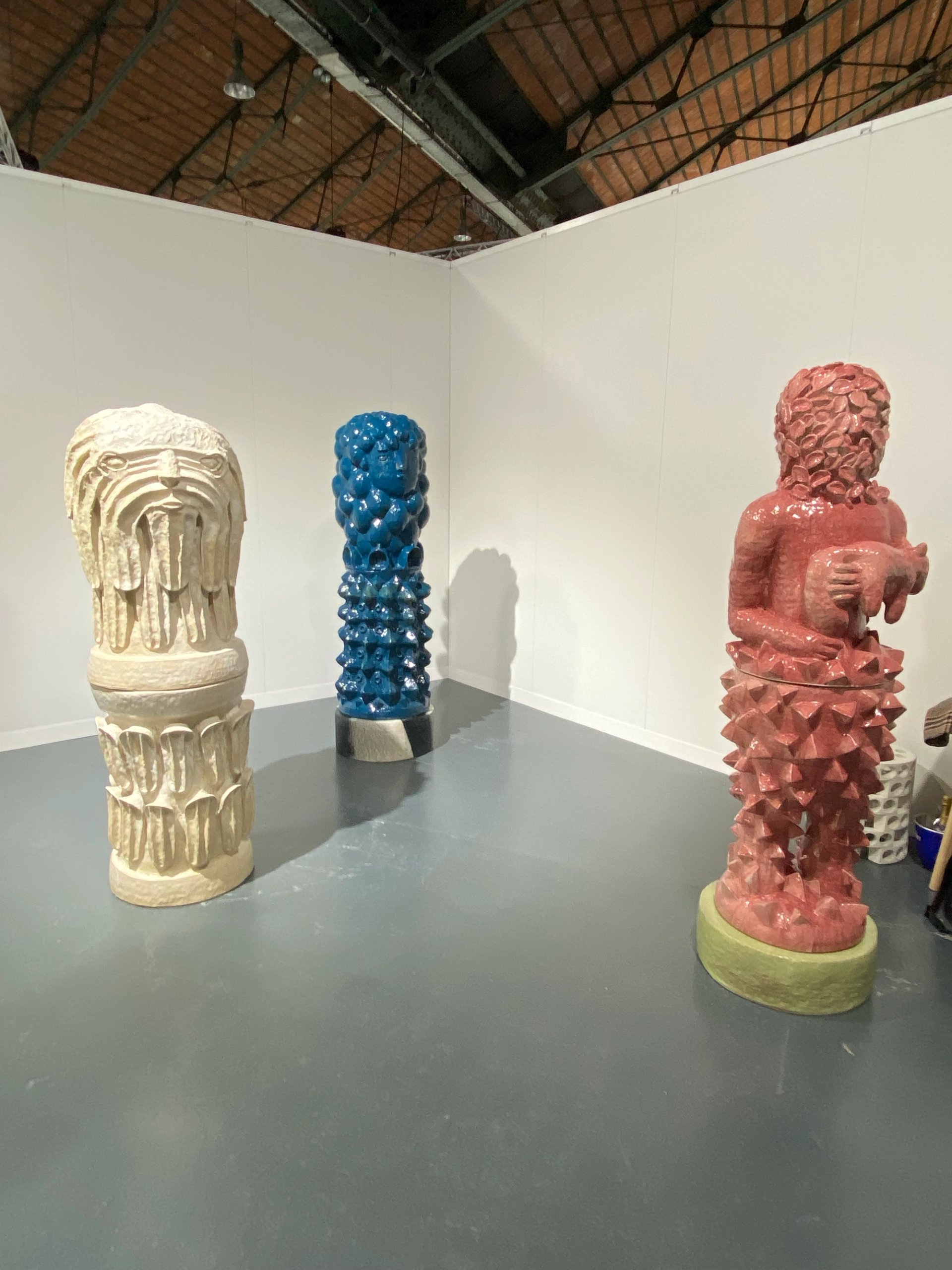 Avec sa cinquantaine d’exposants, la foire reste à dimension humaine, d’autant que les accrochages sont particulièrement soignés : on n’installe pas des céramiques, c’est-à-dire essentiellement de la sculpture, comme des tableaux ou des photographies. La problématique des socles trouve ici des solutions parfois des plus originales, la palme revenant à la galerie Jacques Cerami (Charleroi) qui a renouvelé l’usage des portes en bois sur tréteaux pour présenter les figurines de Manuel Sanchez-Algora (des pièces uniques affichées de 2 200 à 3 200 euros).