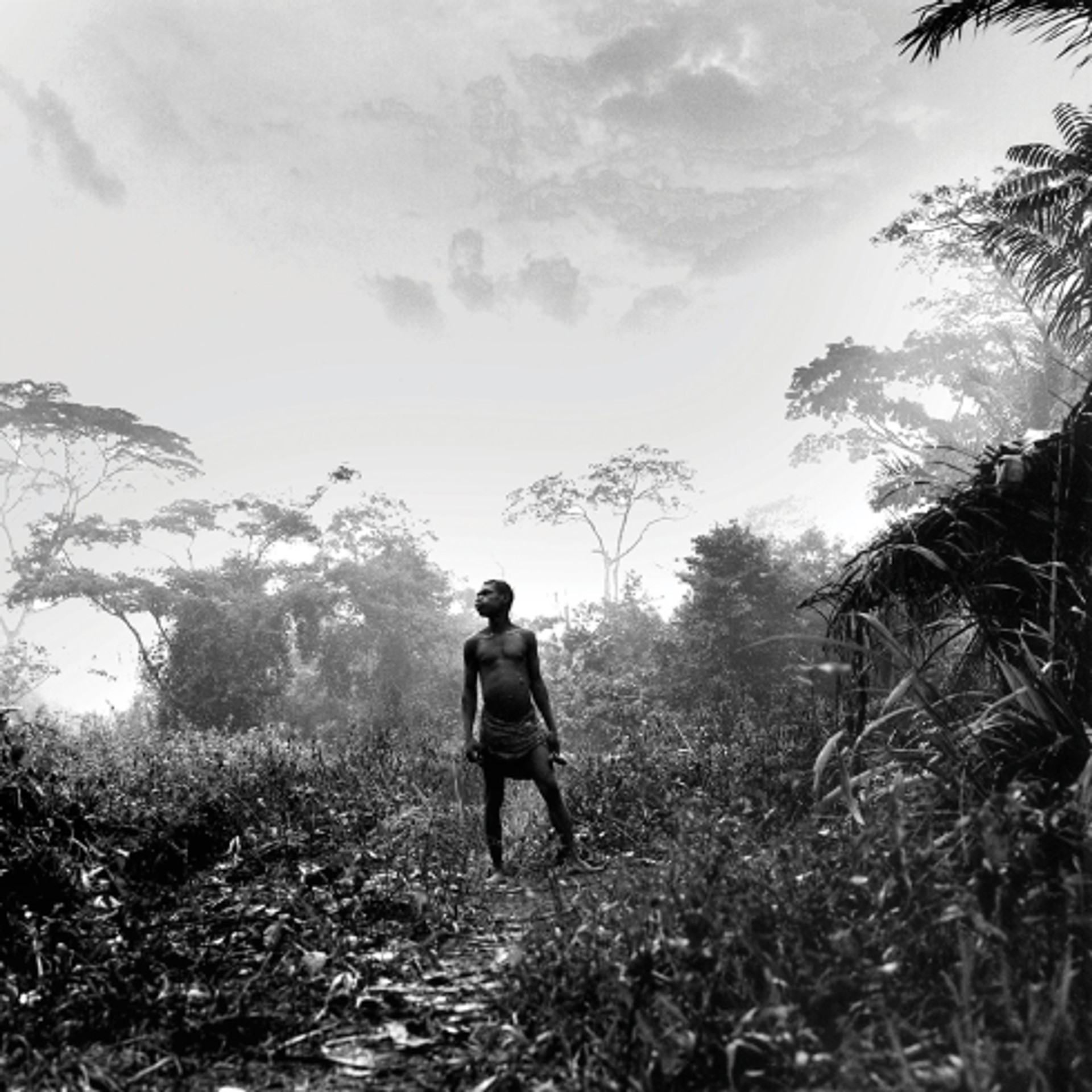 Bernard Descamps, Boko dans la clairière de Mabala, série Pygmées Aka. L’esprit de la forêt, Centrafrique, 1996, photographie argentique noir et blanc. © Bernard Descamps