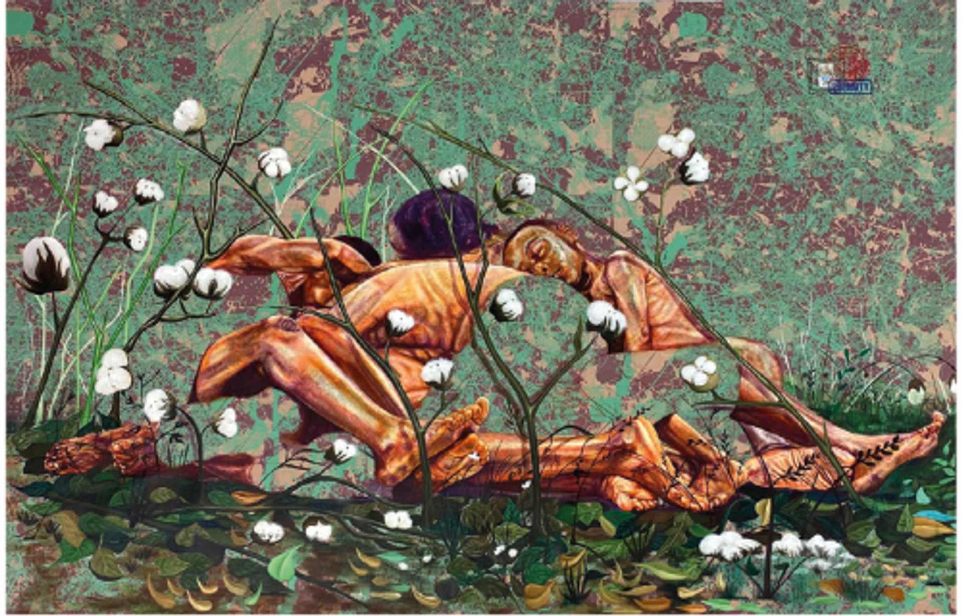 Jean David Nkot, ##La Sueur de mon corps dans les champs de coton##, 2023, acrylique et sérigraphie sur toile. © Afikaris