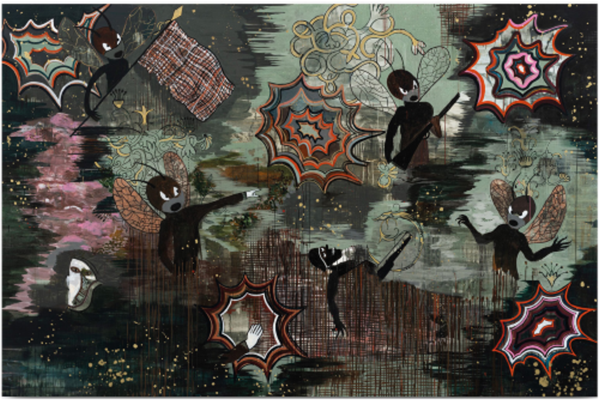 C’est surtout le film d’Abel Gance, J’accuse, en 1919 – Zola écrit J’accuse…! Mais je mets toujours mes titres après. Je me suis intéressée à l’histoire de Felix Kersten, le masseur-soigneur de Heinrich Himmler, dont Joseph Kessel parle dans son livre Les Mains du miracle [1960], l’histoire d’un médecin qui échangeait ses soins contre la libération de communistes et de juifs. Les uniformes, les blasons, l’héraldique reviennent souvent dans mes œuvres, malgré moi. Les croix blanches viennent des cimetières militaires. Il y a aussi une bestiole qui pique, que l’on retrouve dans d’autres tableaux. Dernièrement, j’ai regardé beaucoup de dessins animés de propagande soviétique et américaine comme Der Führer’s Face [1943], dans lequel Donald fait un cauchemar sur les nazis, ou encore Le Dictateur de Charlie Chaplin [1940].