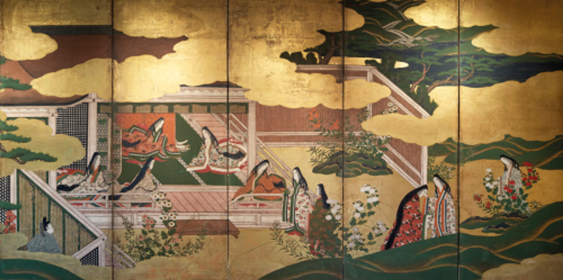 Paravent à six volets, illustration du Dit du Genji, livre XXVIII : «Nowaki» (La Tempête), école Tosa, époque Momoyama, fin XVIe -début XVIIe siècle, encre, couleurs, or et feuilles d’or sur papier, collection particulière. © Marc Boyadjian