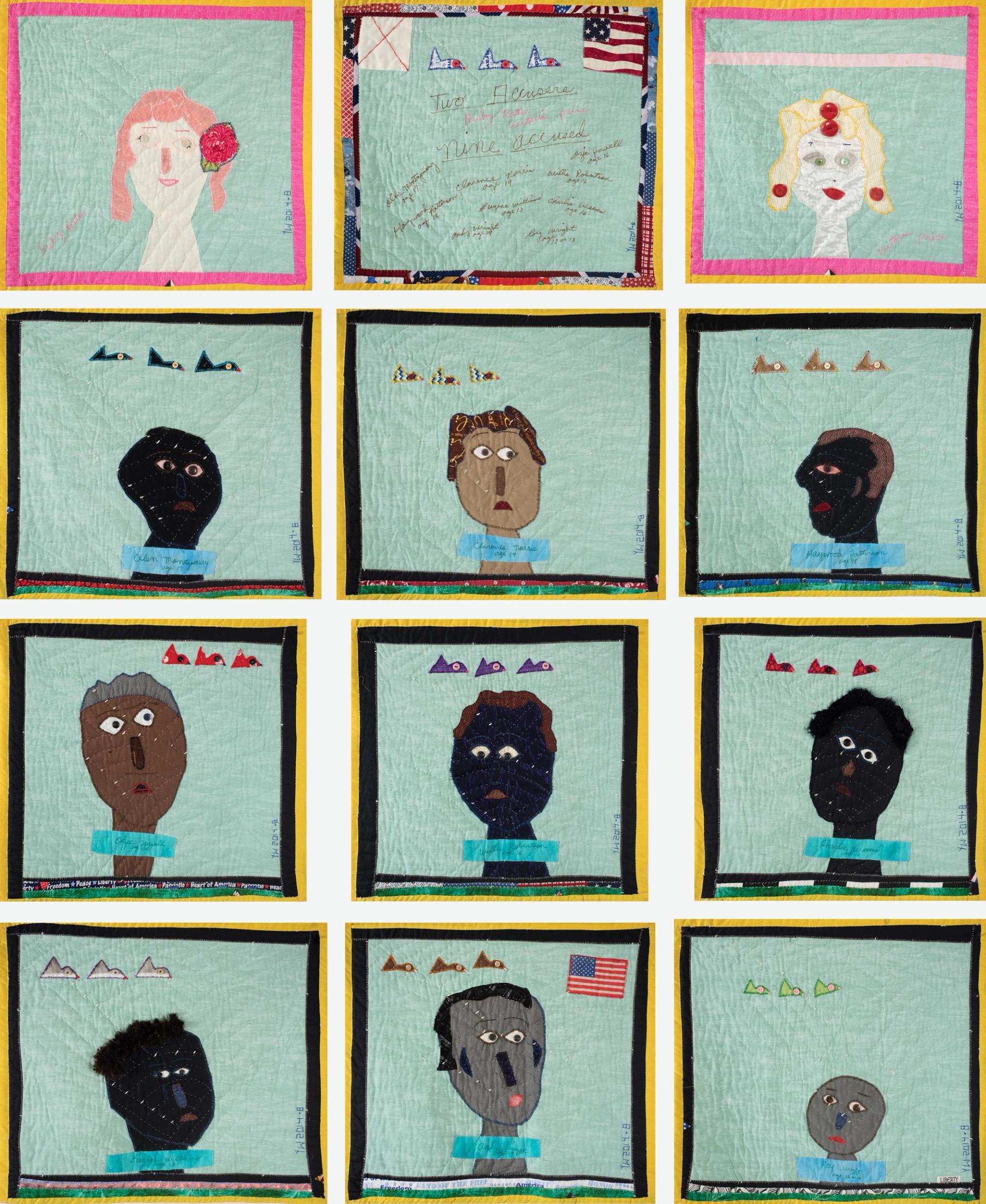 Yvonne Wells, Two accusers, nine accused, 2014, tissus, 12 pièces. Courtesy Marguo