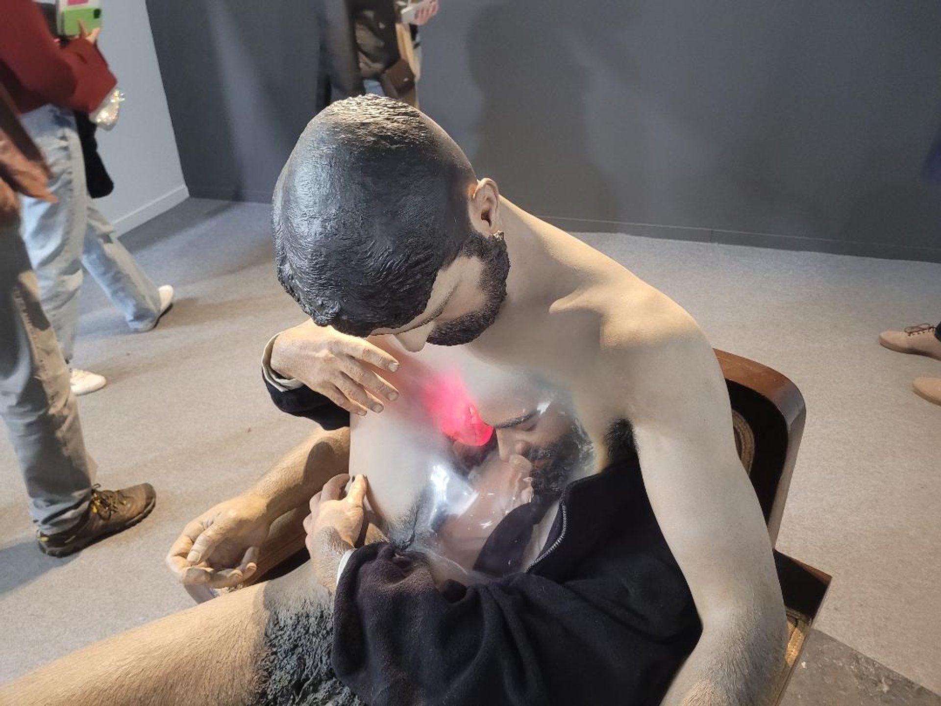 Il est possible d’y faire des redécouvertes, à l’instar de la sculpture hyperréaliste de Rodrigo Muñoz Ballester représentant un homme habillé enlaçant un autre homme nu, sa main touchant le cœur de l’inaccessible bien aimé. L’œuvre avait déjà été présentée sur la deuxième édition de la foire… en 1983. Un mécène de la Tate de Londres l’avait acquise mais à son décès, son compagnon l’a restituée à l’artiste. La sculpture était l’un des clous de cette édition, proposée à 80 000 euros par la galerie José de la Mano (Madrid), qui consacrait un focus à des artistes femmes (plusieurs pièces acquises par le musée Reina Sofia de Madrid) et un autre à la scène homosexuelle sous Franco, un sujet encore difficile à montrer sur une grande foire espagnole, selon le galeriste.