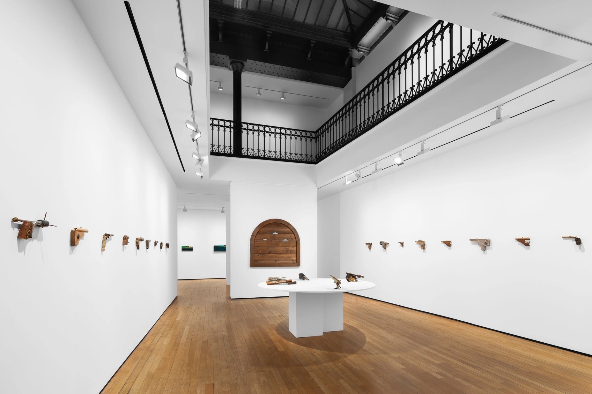 Il y a beau temps que Daniel Dezeuze a délaissé l’analyse et le démontage du tableau pour donner à son art un tour ethnographique. Le tableau n’a jamais tout à fait disparu, mais à partir de lui se sont greffées des histoires et des rencontres avec, par exemple, le monde des cueilleurs ou celui des braconniers. Preuve est donnée de cette persistance du tableau avec la présentation en ouverture d’un ensemble de boucliers, faits de châssis en baguette souple et de treillages bariolés avec parfois quelques ornements de faux luxe. Leur fait suite une véritable salle d’armes où trois des murs sont couverts de petits pistolets ou arbalètes miniatures faits de pièces de bois et de métal récupérés. Au centre de cette salle, une table de négociations où devant chacune des quatre chaises est posé un petit canon en lieu et place d’argumentaire. Derrière un aspect de rétro avant-garde, la table signifie bien une façon de se mettre à l’écoute d’autres pratiques manuelles, et de se placer en complicité vis-à-vis d’elles.