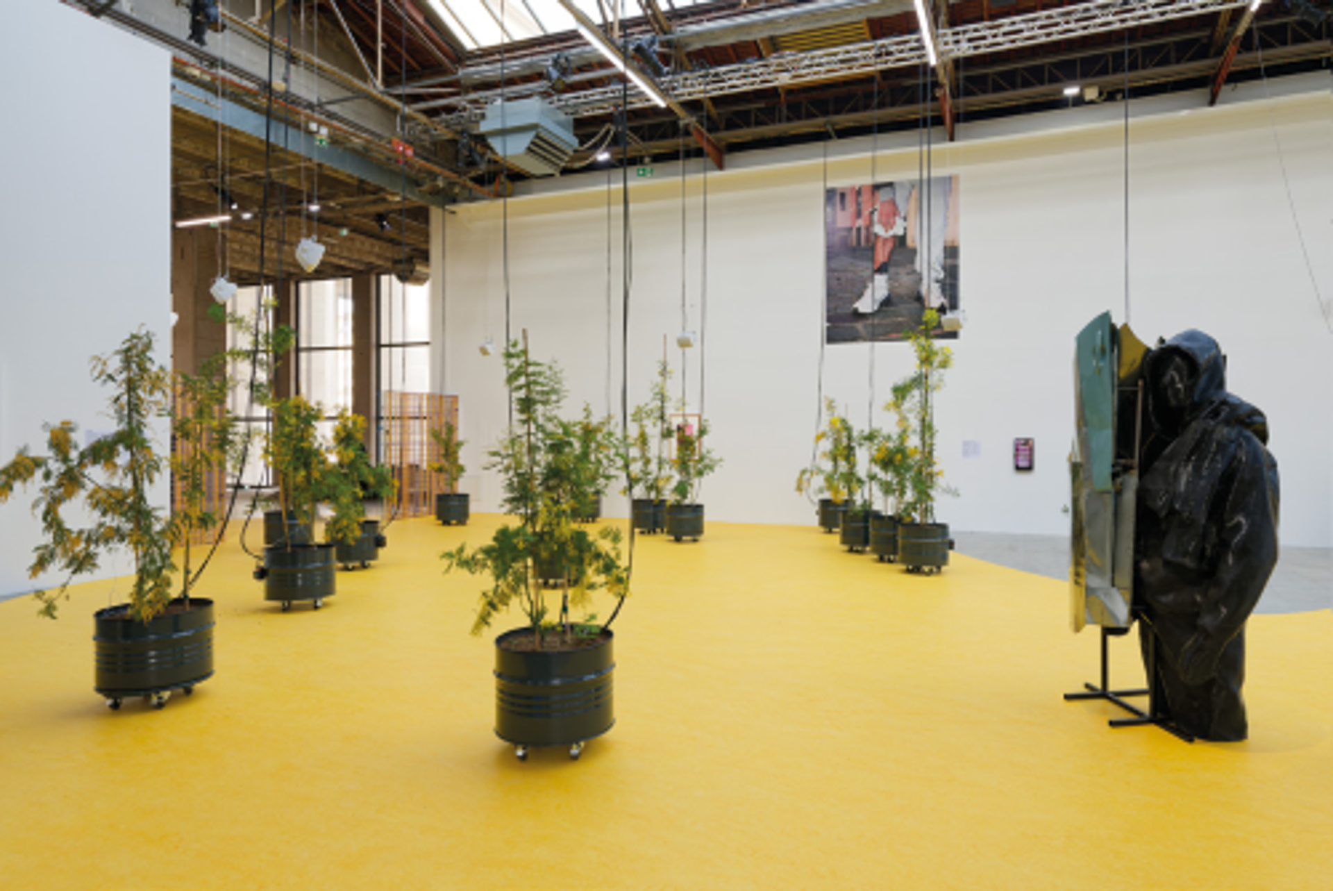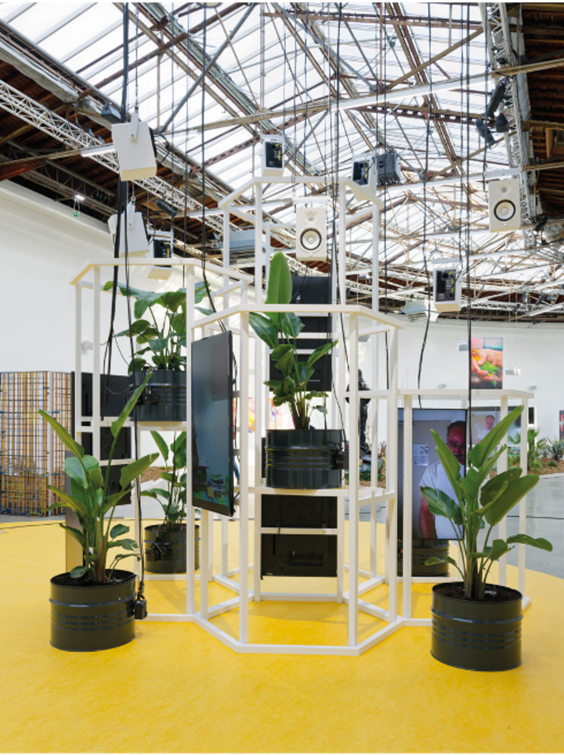 « Signal » est un jardin dans lequel on se promène de massif en massif, dans lequel on écoute le bruit des mimosas et le son de vidéos dont les voix peuplent ces bosquets. Car des écrans sont disposés tout au long de l’exposition, diffusant chacun le même film simultanément. Le sol est jaune par endroits, c’est un jardin méditerranéen – dont on devine d’ailleurs des bribes dans le film Les Oiseaux de paradis (2018-2020), tourné dans un hôpital psychiatrique de Blida, ville algérienne où Mohammed Bourouissa est né en 1978. Brutal Family Roots (2020), l’installation qui met en scène ces mimosas, est présentée à Paris pour la première fois. Commencée à Sydney, pour la Biennale, elle évoque la migration des acacias d’Australie en Algérie. Et l’on va d’une œuvre à l’autre, revenant parfois sur nos pas, dans un parcours qui n’est jamais imposé. D’ailleurs, la courbe du Palais de Tokyo a été prolongée, comme pour nous faire tourner indéfiniment. Quelques murs arrêtent le regard, qui sont aussi des sculptures colorées. Sont-elles comme des folies ou des machines dans les jardins de la Renaissance ? Ce motif du jardin, Mohammed Bourouissa va continuer de s’y pencher dans les mois à venir, à l’occasion d’une résidence sur Instagram intitulée « Jardin public », un portrait filmé des Tuileries.