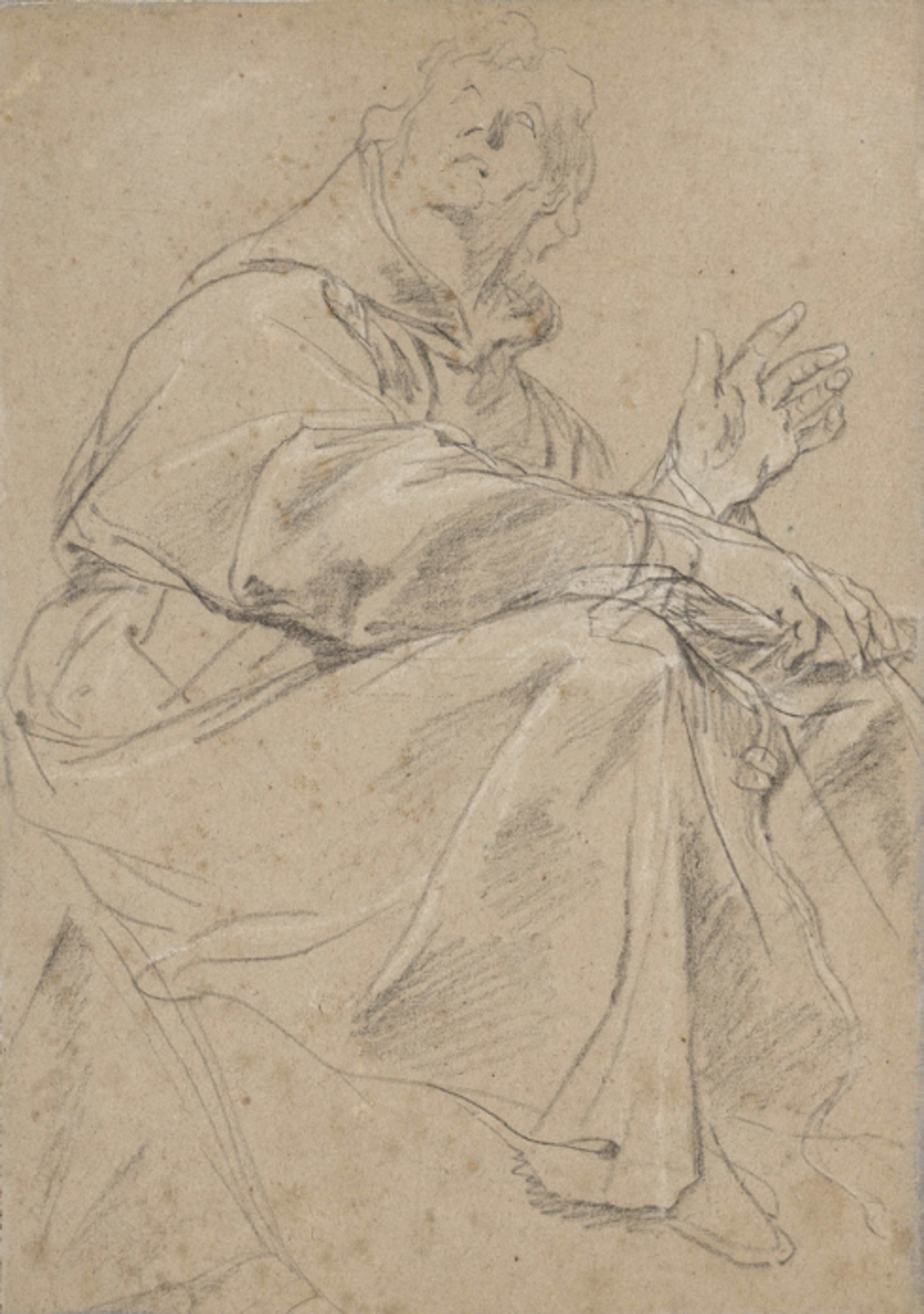 Antoon Van Dyck, Étude d’un moine franciscain assis levant les yeux, première moitié du XVIIe siècle, pierre noire, rehaussée de blanc, est. 100 000-150 000 euros. © Christie’s