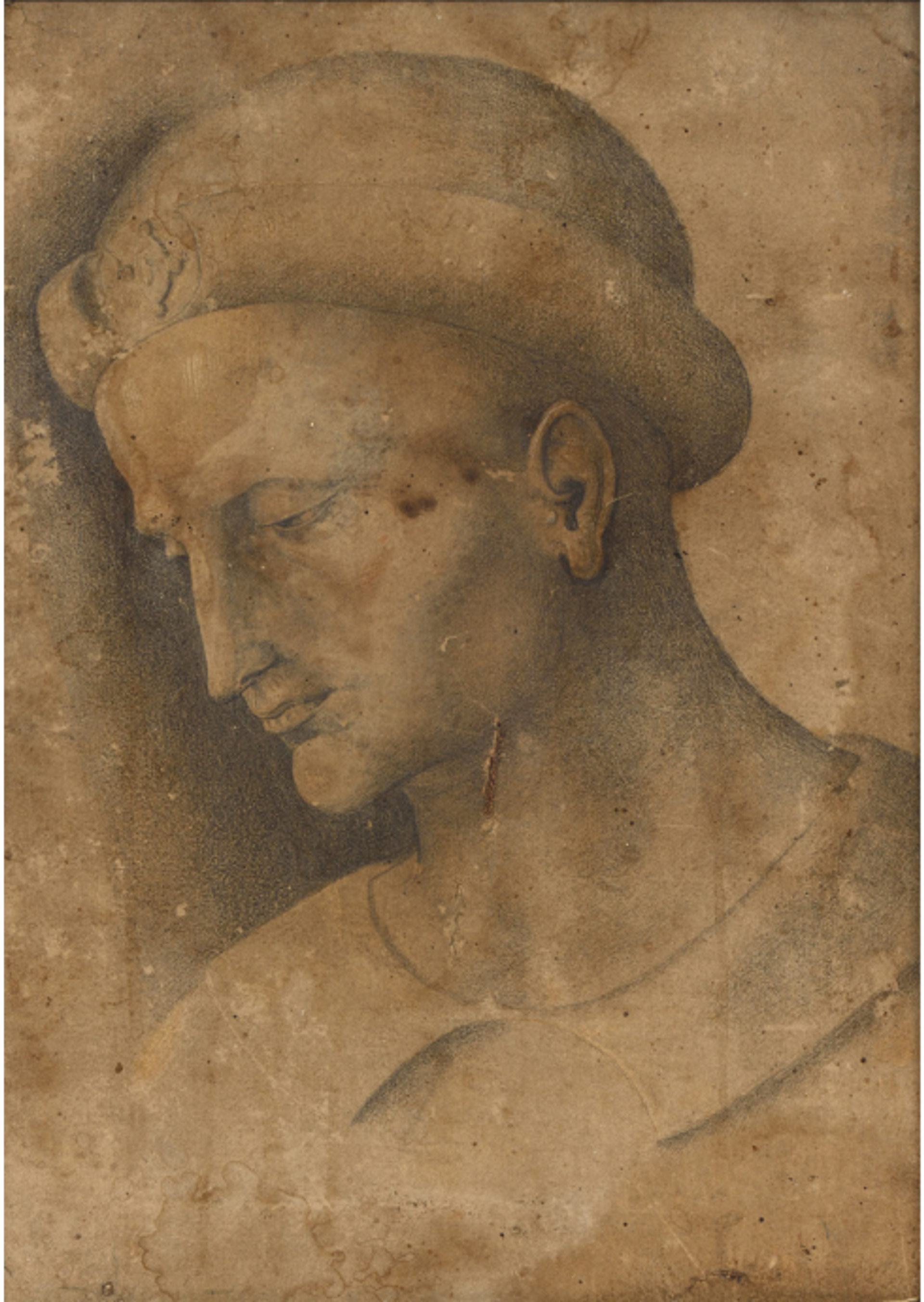 Le Pérugin, Buste d’homme de trois quarts vers la gauche, portant un chapeau, vers 1500-1520, pierre noire et rehauts de gouache blanche sur papier marouflé sur toile, est. 20 000 - 30 000 euros. © Millon