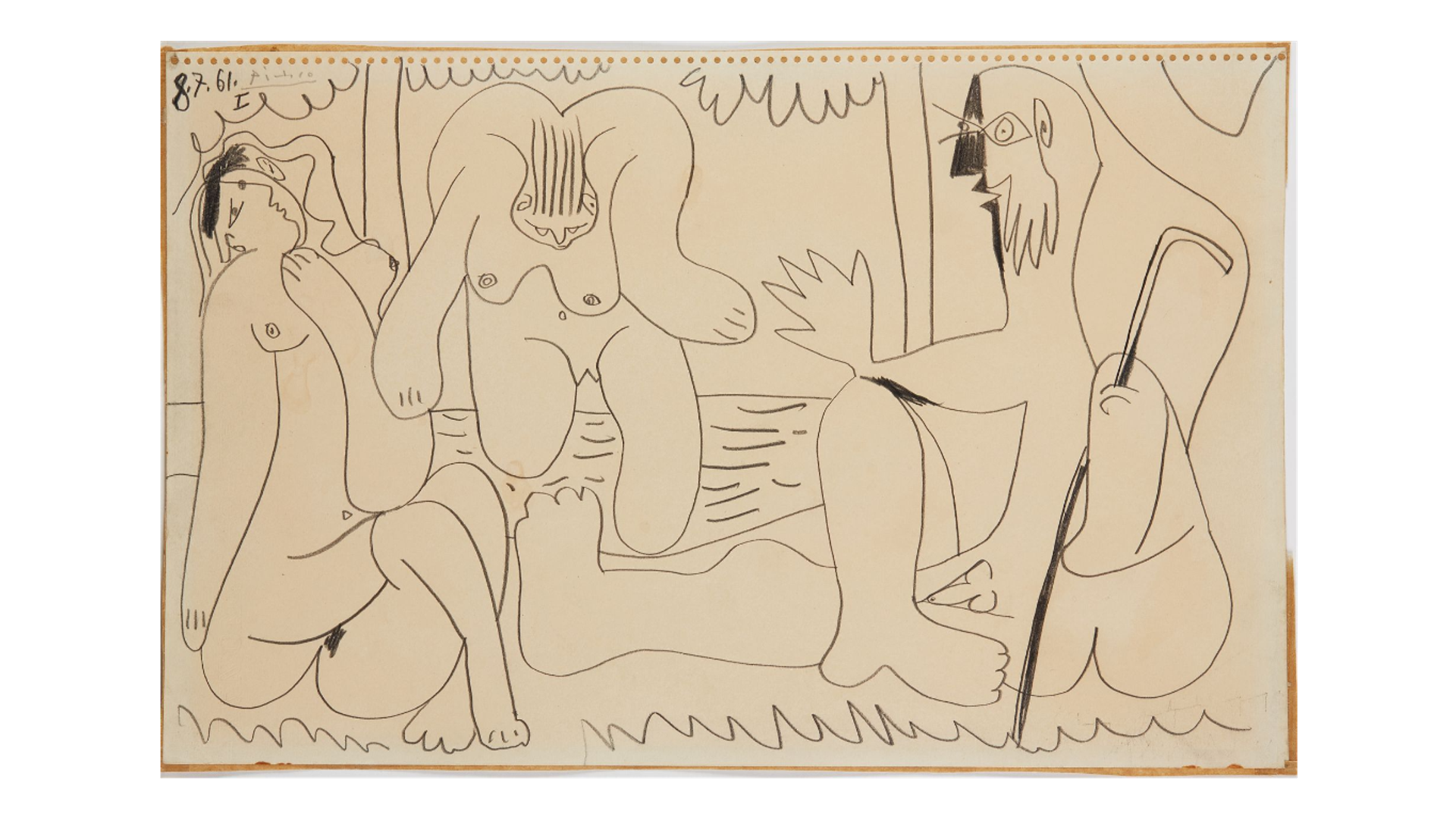 Plus de vingt ans plus tard, les premiers dessins qui interprètent l’œuvre du peintre impressionniste apparaissent. Ce travail d’appropriation marquera la carrière de Picasso, qui réalisera quelque 150 dessins et trouvera son épilogue dans les années 1970. L’œuvre proposée par la maison de ventes Blanchet & Associés, un dessin au crayon gris estimé entre 120 000 et 150 000 euros, date de 1961. Cette année-là dénote une petite révolution dans les recherches de Picasso : les quatre personnages de la peinture originale sont réduits à trois, mais surtout ils sont tous nus… Victorine ressemble de plus en plus à Jacqueline Roque, la femme du peintre, lequel semble se représenter lui-même dans ce personnage du « Causeur », vieilli et qui perd ses cheveux. Une façon pour l’artiste de pousser, non sans humour, Manet vers la sortie ?