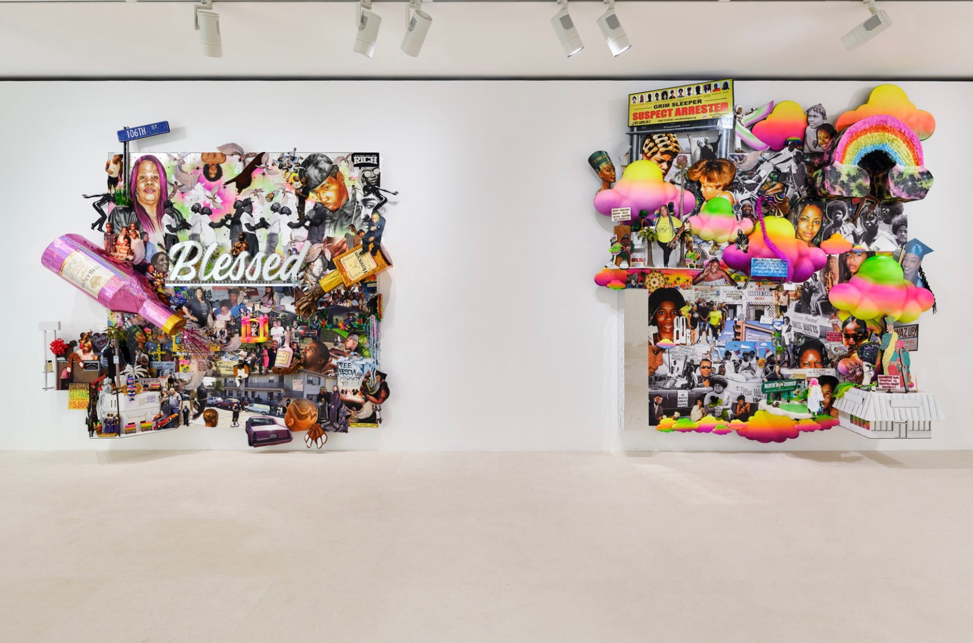 Les œuvres qu’expose Lauren Halsey sont un hymne à South Central Los Angeles, à ses communautés, au Funk et à la Great Black Music en général, nourries d’énergie positive et de l’esprit de l’utopie. Les foil works (2011 - en cours) présentés au rez-de-chaussée sont de grands panneaux muraux composés d’une accumulation de photos découpées et d’objets. Ils sont des portraits de héros, d’amis, d’anonymes, de figurines diverses, compilations de textes de flyers, ou d’enseignes publicitaires, maquettes d’architecture ou de bouteilles d’alcool factices, mais aussi des panthères noires bondissantes. Il n’y a pas de retouche ou de prétention à transférer le « low » vers le « high », mais la volonté au contraire de montrer cette culture afro-urbaine dans toute sa richesse, sa diversité, ses excès et sa frime, son inventivité visuelle et langagière. Lauren Halsey témoigne de préoccupations actuelles en s’appuyant sur les thèmes et la bande sonore des années 1960 et 1970, n’hésitant pas à affubler James Brown d’une moumoute arc-en-ciel pour en élargir sa « prideness ».