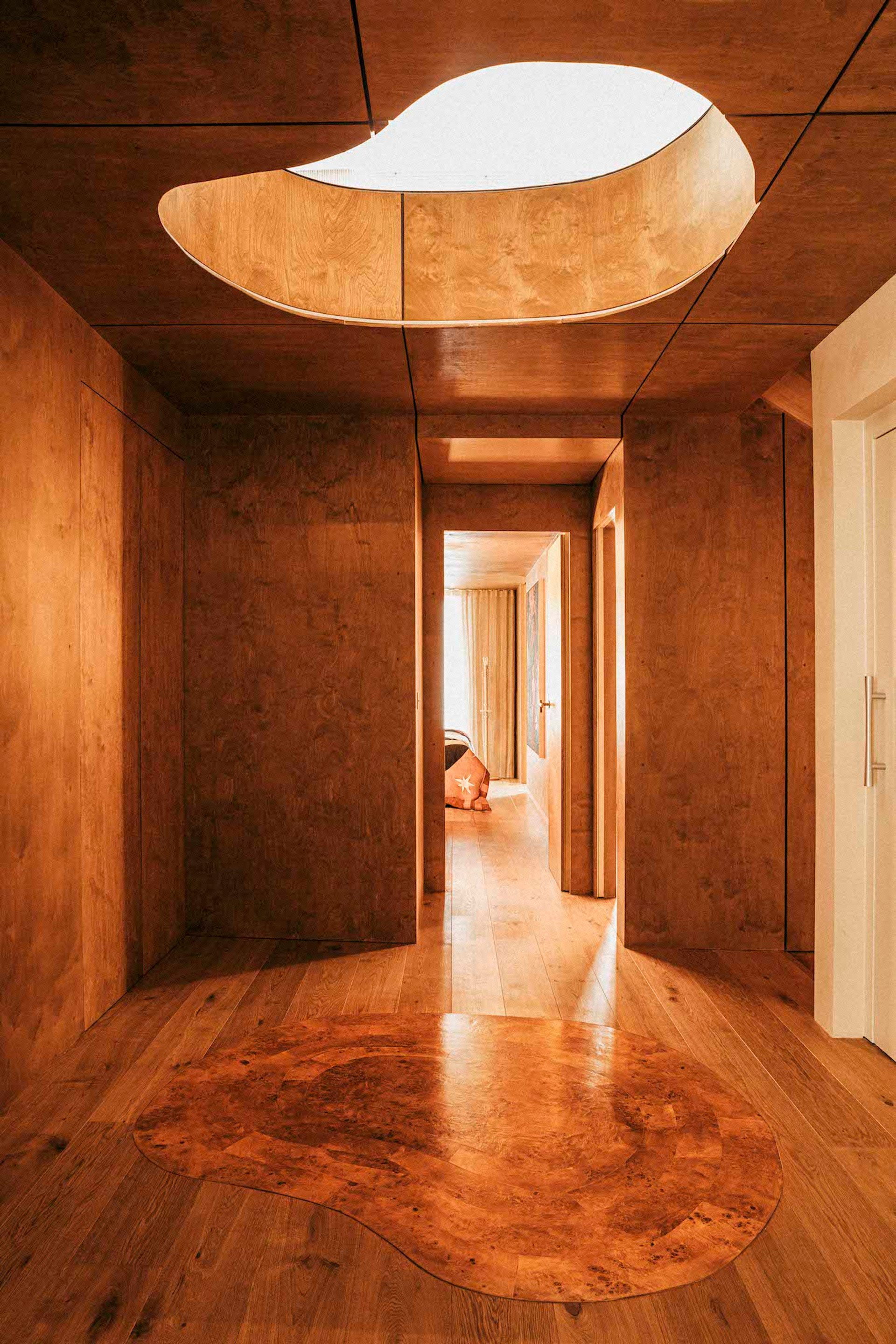 Le lieu a été pensé comme une grande cabane : hormis un soubassement en béton et la singulière façade en pisé – en terre crue de Beauvais –, la structure de son architecture est en bois. La nature et la forêt tiennent à cœur à Sarah Valente, maître d’ouvrage de la Casa Franca. Cet intérêt s’est développé lors d’un voyage au Brésil en 2019, mais aussi, plus jeune, en Guadeloupe avec son grand-père maternel. « En référence aux maisons construites dans les arbres telles des cabanes, nous avons suggéré un tronc imaginaire qui traverserait la maison dans sa hauteur, à travers des marques ou une découpe au sol », précise Sarah Valente. Celles-ci créent un jeu d’ouvertures et de failles lumineuses zénithales. Un motif revient dans la Casa Franca. Il s’agit de l’Ouroboros, serpent qui se mange la queue, symbole de l’infini, et que l’on retrouve dans certaines œuvres exposées.