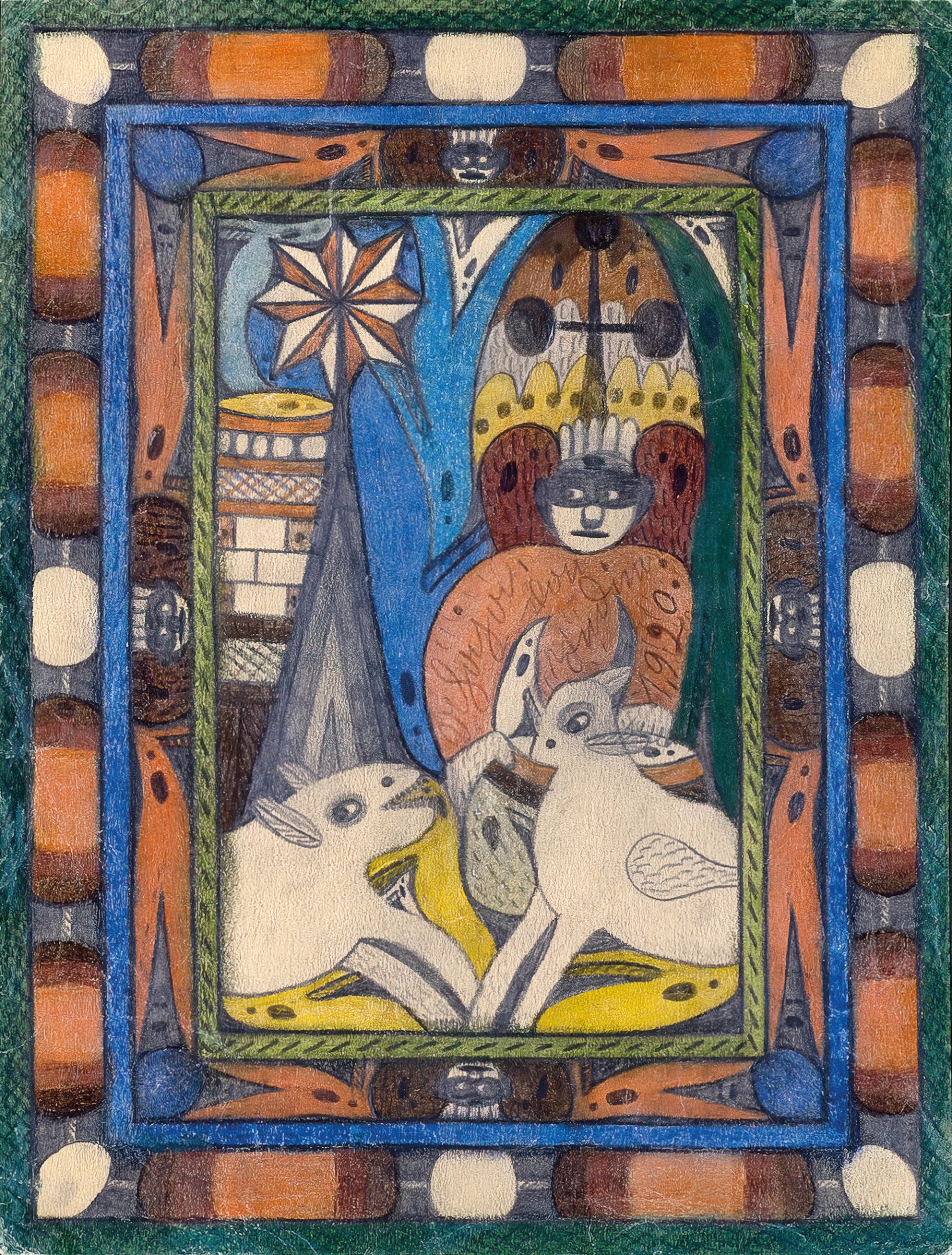 Aloïse Corbaz, Sans titre, entre 1940 et 1950, craie grasse, crayon de couleur et collage sur papier. © Collection Bruno Decharme