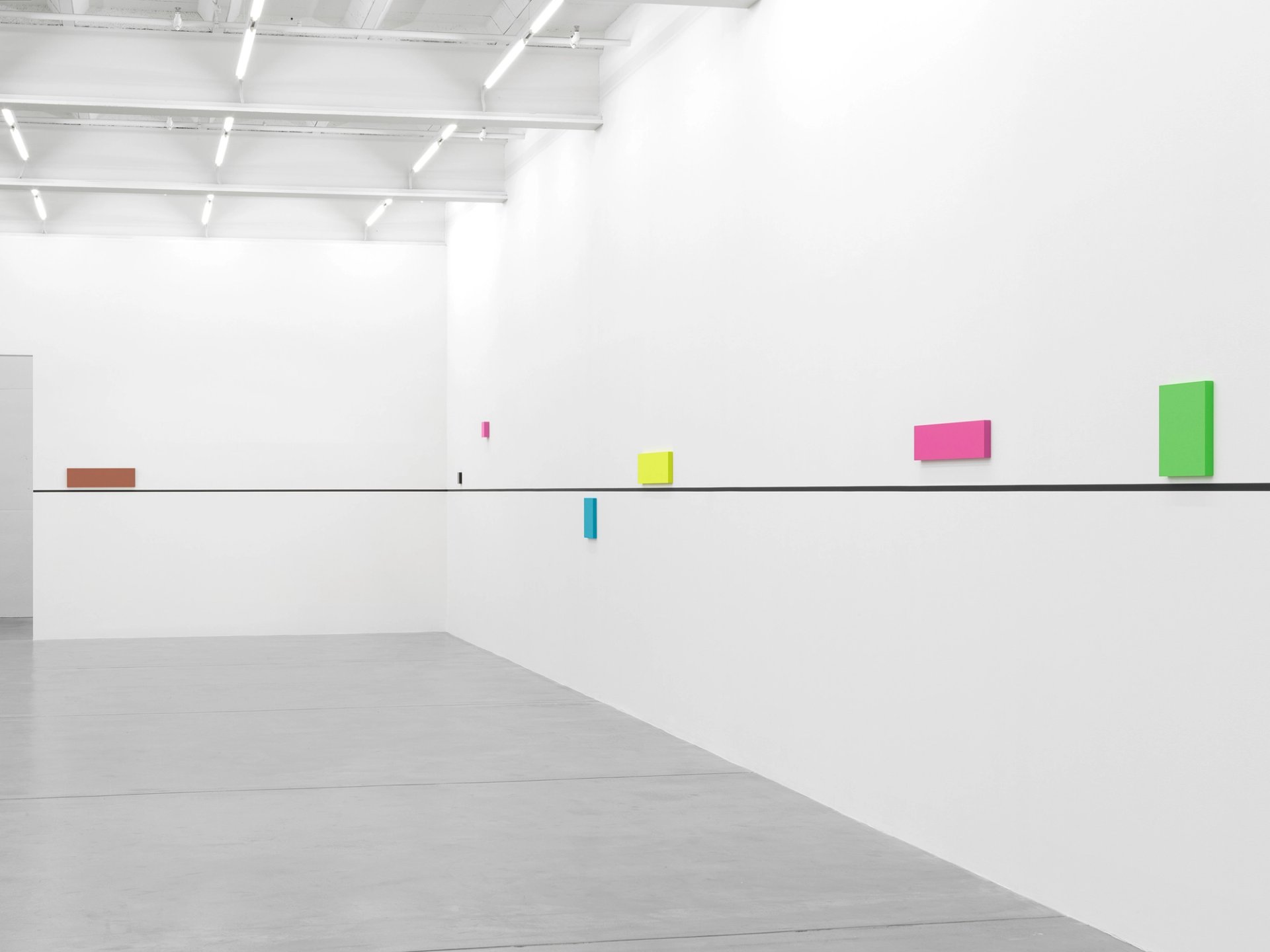 Intitulée « bass+ (re)modification », l’exposition présente 26 petites peintures carrées et rectangulaires en MDF de différentes couleurs et dont les formats sont inversement proportionnels à la taille de la salle. Une ligne noire, qui court le long de tous les murs, délimite le champ de l’accrochage de ces « objets », comme leur auteur les appelle. Tous sont ainsi exposés un peu au-dessus ou juste en dessous, selon un protocole qu’on imagine très précis.