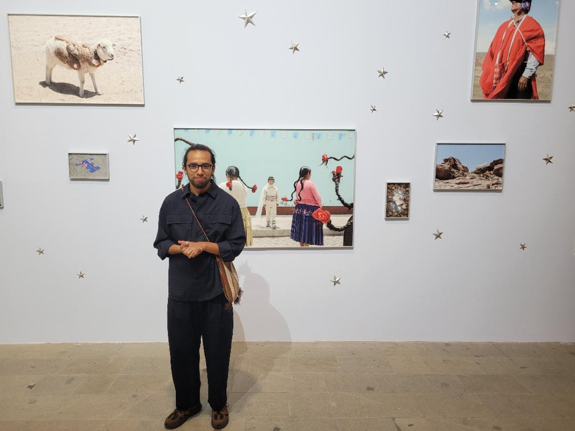 L'artiste bolivien River Claure devant la photographie d'une série adaptée du petit Prince de Saint-Exupéry, commencée en 2022. Photo A.C.