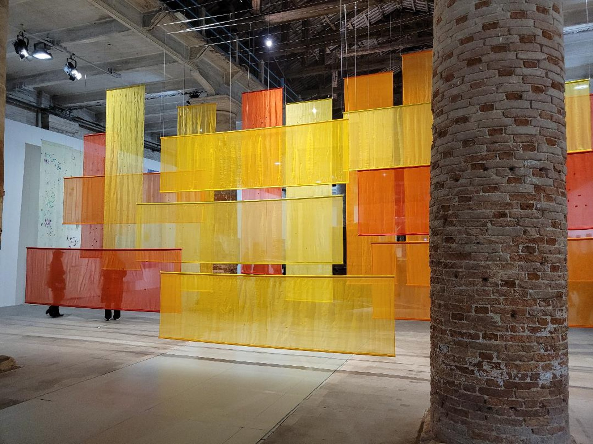 C’est ainsi l’art aborigène d’Australie qui accueille les visiteurs à la Corderie. Ailleurs, c’est un Maori de Nouvelle-Zélande, Fred Graham, dont on peut voir des sculptures en bois des années 1970. Originaire du Mexique et établie à Berlin, Frieda Toranzo Jaeger a conçu pour sa part d’immenses panneaux, peintures à l’huile enrichies de broderies. Son utopie féministe et queer s’inspire des murals mexicains. Au revers, des dessins adressent des clins d’œil à l’île de Lesbos ainsi qu’à Frida Kahlo. Semi abstrait, les récents travaux d’Emmi Whitehorse, artiste indienne Navajo de Santa Fe, aux États-Unis, s’avèrent plus allusifs, tout comme les poétiques tentures de Dana Awartani, qui ne sont pas juste une installation colorée de plus. D’origine palestinienne, l’artiste a imbibé ces voiles de soie de teintures de colorants aux propriétés médicinales, évocation subtile et discrète des destructions et des blessures à Gaza, qui coulent comme des larmes sur le tissu.