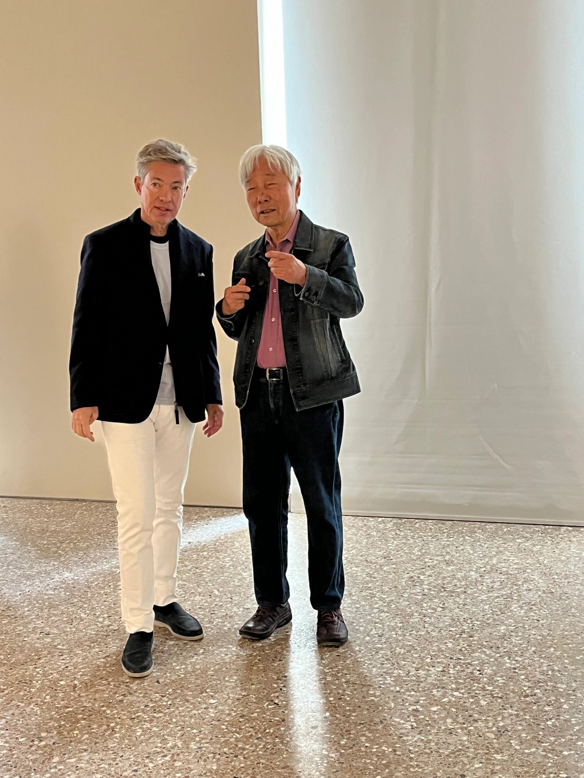 Nicolas Berggruen et Lee Ufan dans l'une des salles présentant une œuvre de l'artiste coréen au Palazzo Diedo ce 19 avril 2024. Photo : Stéphane Renault