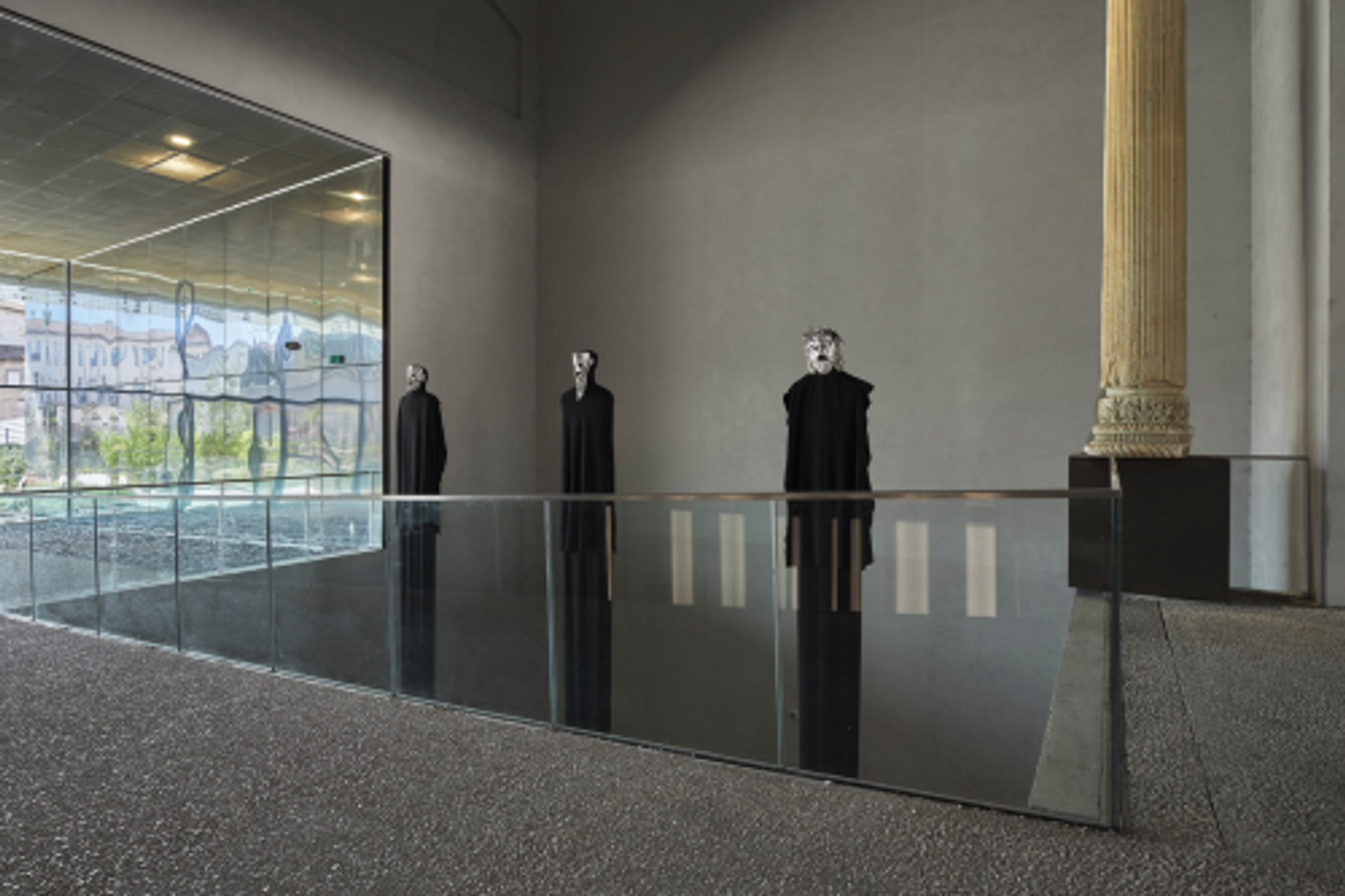 De même, c’est une véritable architecture commune que l’artiste et architecte franco-afghan Feda Wardak et Tadashi Kawamata ont réalisée. On reconnaît les matériaux de l’un, on devine les formes de l’autre. Ils ont détourné l’eau des bassins des jardins de la Fontaine, qu’ils font rejaillir comme une source, pour rendre hommage au site de Nîmes – cette œuvre peut faire penser à Détournement, l’installation de Stéphane Thidet à La Conciergerie, à Paris, en 2018. Dans une collaboration bien réelle également, Valentin Noujaïm, diplômé de la Fémis et ancien pensionnaire de la Villa Médicis, et le cinéaste et artiste Ali Cherri ont choisi la figure d’Héliogabale, jeune empereur romain anarchiste, assassiné à l’âge de 18 ans en raison de ses excès et longtemps effacé par l’historiographie romaine. Leur installation vidéo prend place dans la « rue romaine » du musée de la Romanité. Sous un porche, les longs pieds de trois écrans ont leurs racines dans les profondeurs du sous-sol, de sorte que les images semblent surgir d’un terrain de fouilles archéologiques. De l’autre côté du passage, trois masques de tragédie antique, conçus par Ali Cherri, chuchotent des mots devant ces vidéos tournées dans le temple de Diane.
