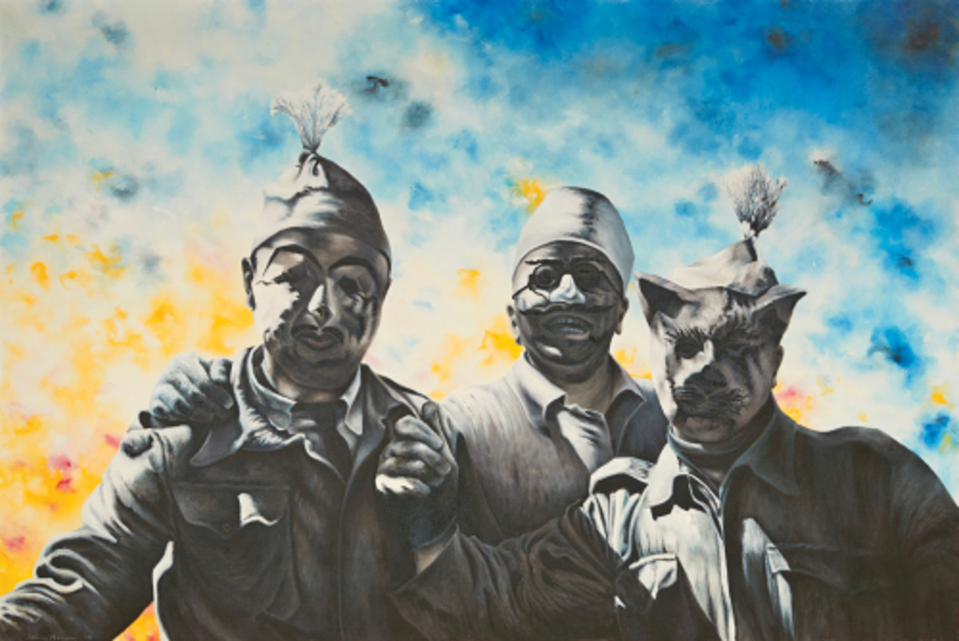 Si cette année, c’est Julien Creuzet qui occupe le Pavillon français de la Biennale de Venise (lire son entretien dans The Art Newspaper Édition française d’avril 2024), quatre artistes avaient été invités en 1980 par le commissaire Gilles Plazy à représenter la France : Ladislas Kijno, Antoine de Margerie, Henri Yéru et Sabine Monirys. Deux œuvres de cette dernière, accrochées aux Giardini à l’époque, sont actuellement montrées dans l’exposition personnelle de l’artiste que lui consacre la galerie Kaléidoscope, à Paris. Dans l’espace de la rue Mazarine, les deux peintures se font face. Tableau noir, et pas seulement par ses tonalités, Mais qu’est-ce qu’il imagine celui-là ? (1980) met en scène au premier plan trois femmes largement emmitouflées jusqu’à cacher leurs visages – deux portent de grandes lunettes de soleil en plus de leur écharpe – tenant parfois d’immenses et intrigants sacs blancs qui ressortent sur le fond sombre. Derrière apparaît la silhouette d’un homme tournant le dos, spectre nébuleux. L’artiste a recouvert la toile de fines coulures de pigments s’apparentant à un dripping. En face, la composition est plus colorée, les personnages en grisaille se détachent sur un fond abstrait aux tons jaunes, bleus, rouges, blancs... Les figures aux relents clownesques sont masquées, l’homme au centre a la bouche ouverte, comme s’il était en train de dire quelque chose, des paroles à jamais perdues. À moins que le cartel du tableau ne nous éclaire : Bon, asseyez-vous et pleurez ! (1979). Comme toujours dans les œuvres de l’artiste, les longs titres très littéraires ouvrent sur de nouvelles perspectives, qu’ils soient en décalage ou non avec ce qui est représenté sur la surface picturale.