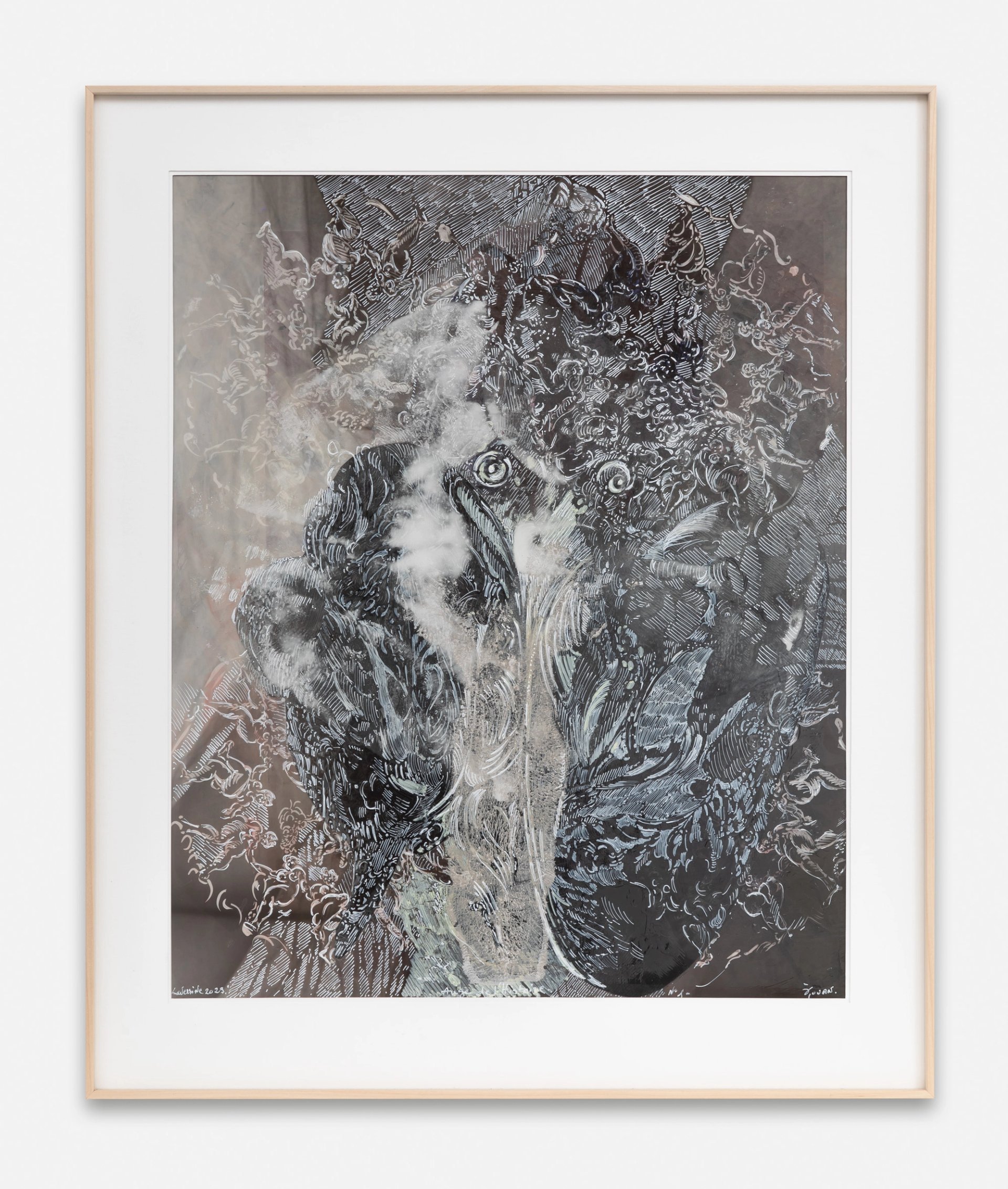 François Rouan, Ange de l’Histoire 1, 2023, peinture à la cire, pastel et poudre de marbre sur photographie argentique tressée.