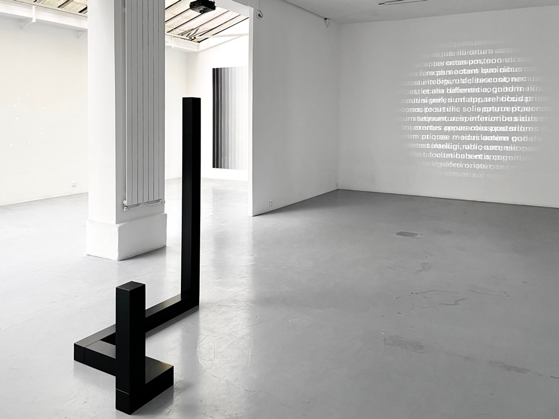 D’autres lignes, d’autres mouvements textuels courent sur les murs, mais également la traduction des deux solstices islandais en deux peintures murales de 12 bandes allant du gris au noir. En conclusion de ces jeux de lecture en noir et blanc est présenté dans la petite salle Iris (2019), un livre de pages blanches ouvert en son milieu sur lequel sont projetées tour à tour chacune des couleurs de l’arc-en-ciel.