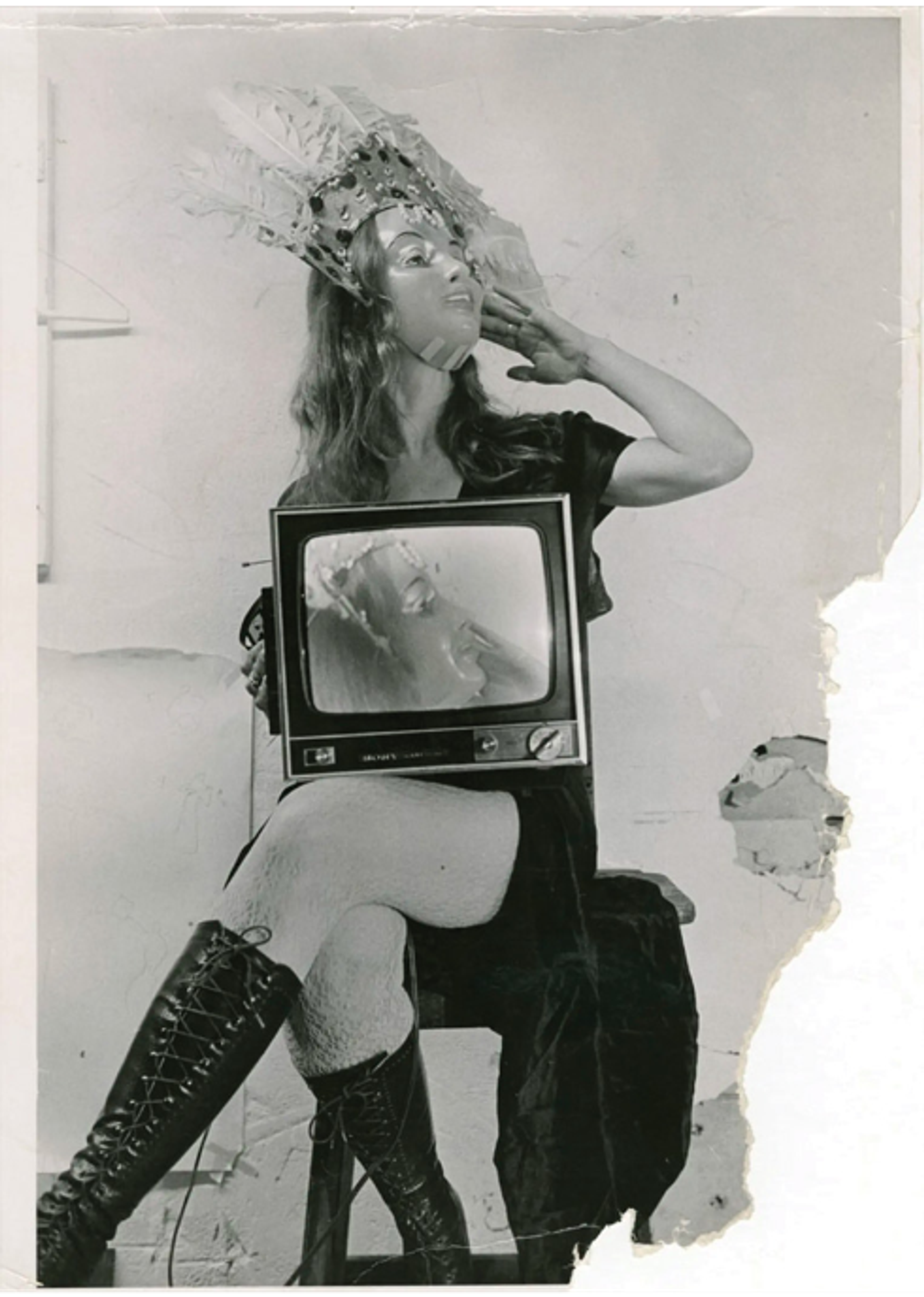 Joan Jonas posant pour une affiche inachevée en vue d’une représentation d’Organic Honey’s Visual Telepathy à la LoGiudice Gallery, à New York, en 1972. © Joan Jonas. Photo Richard Serra