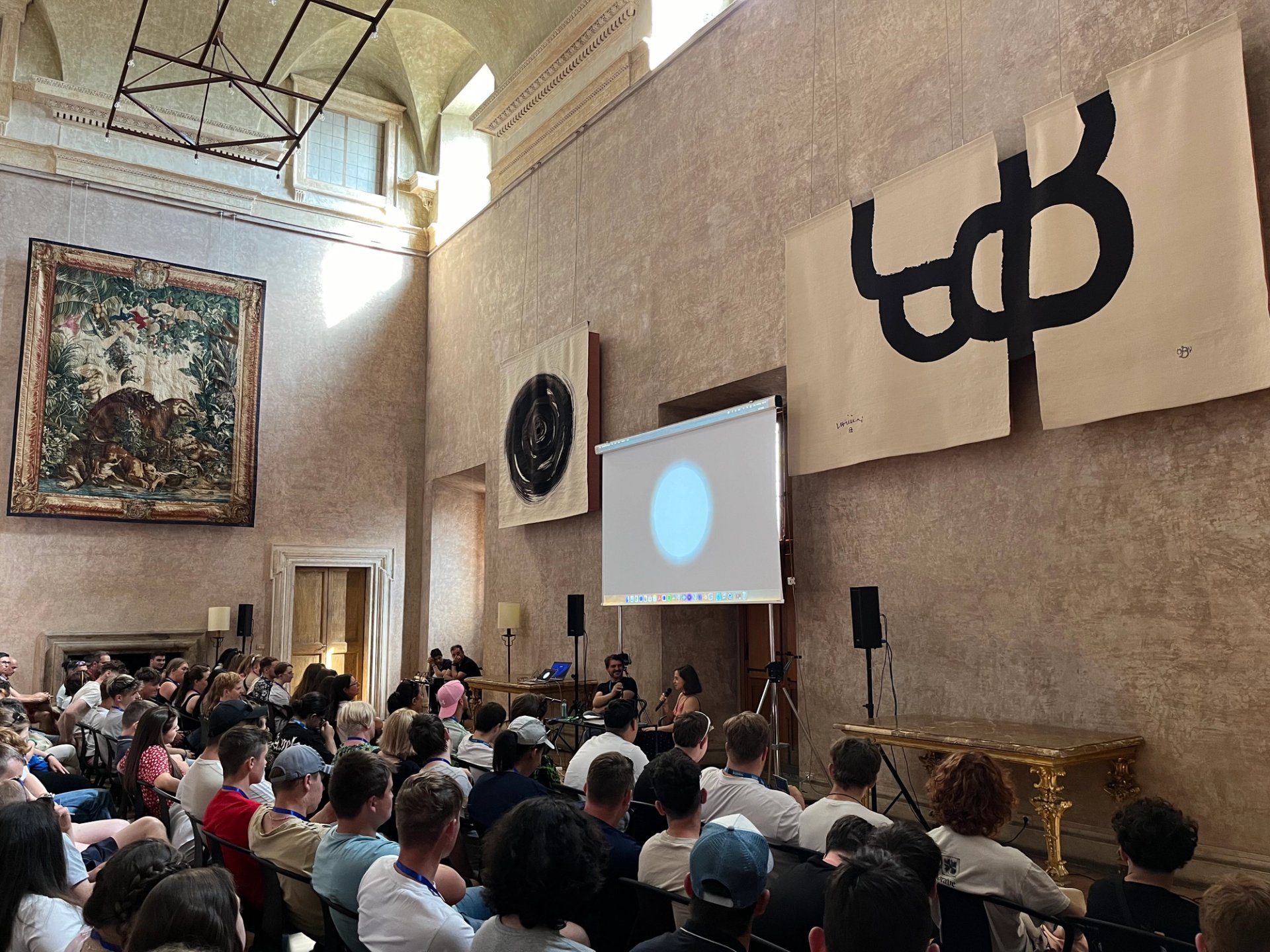 Sam Stourdzé en compagnie des élèves et professeurs lors de la présentation des « chefs-d’œuvre » réalisés par chaque classe dans le cadre de la Résidence Pro, dans le Grand Salon de la Villa Médicis, le 15 mai 2024. © Margherita Nuti