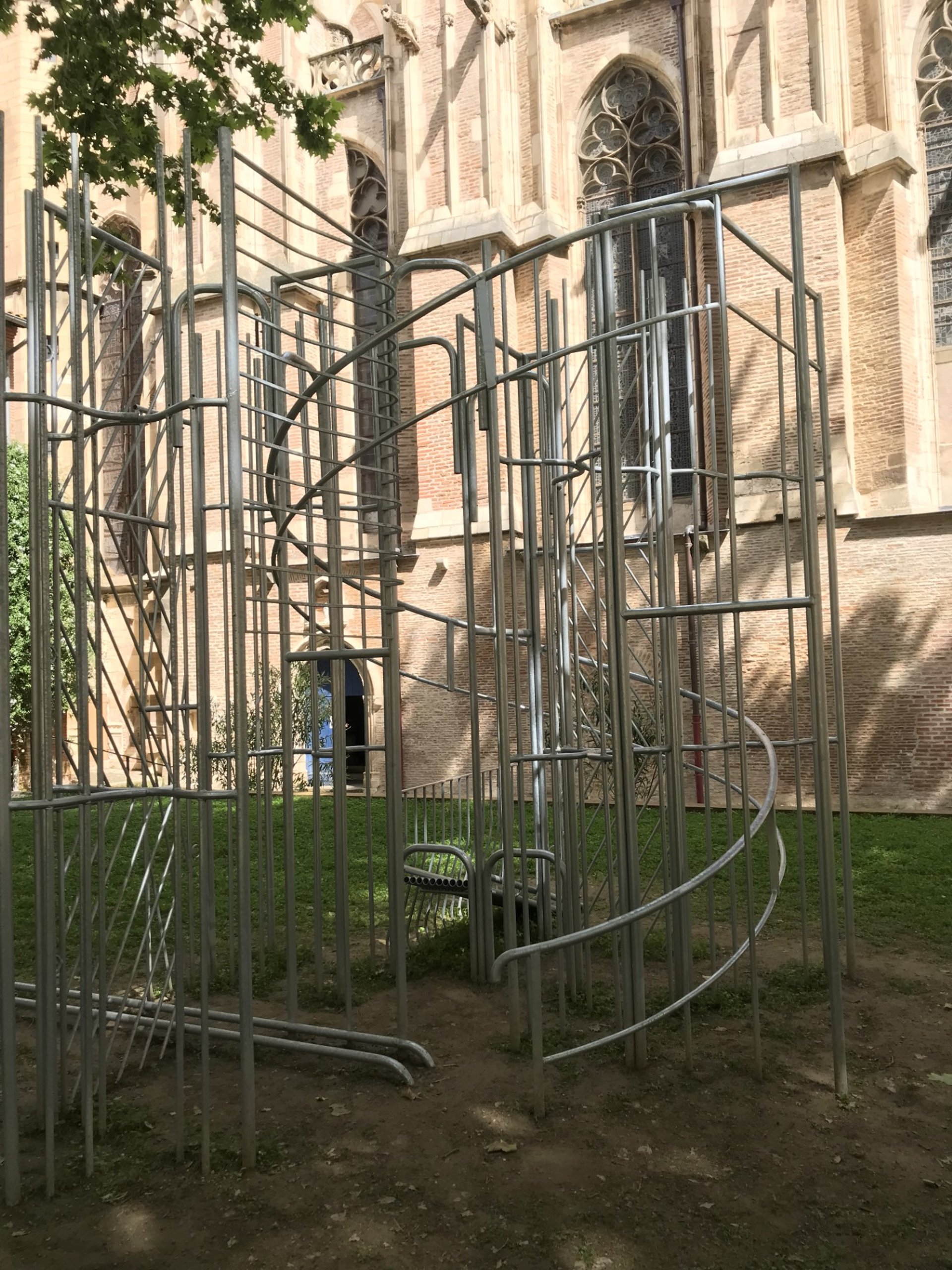 Dans la cour Sainte-Anne, au pied de la cathédrale Saint-Étienne, œuvre de Jennifer Caubet intitulée Où disperserons-nous les cendres du vieux monde ?, une sculpture constituée d'un assemblage d'éléments métalliques – garde-corps, rampes et caillebotis – récupérés dans un ancien siège social d’Airbus, à Colomiers. Photo : Christian Simenc
