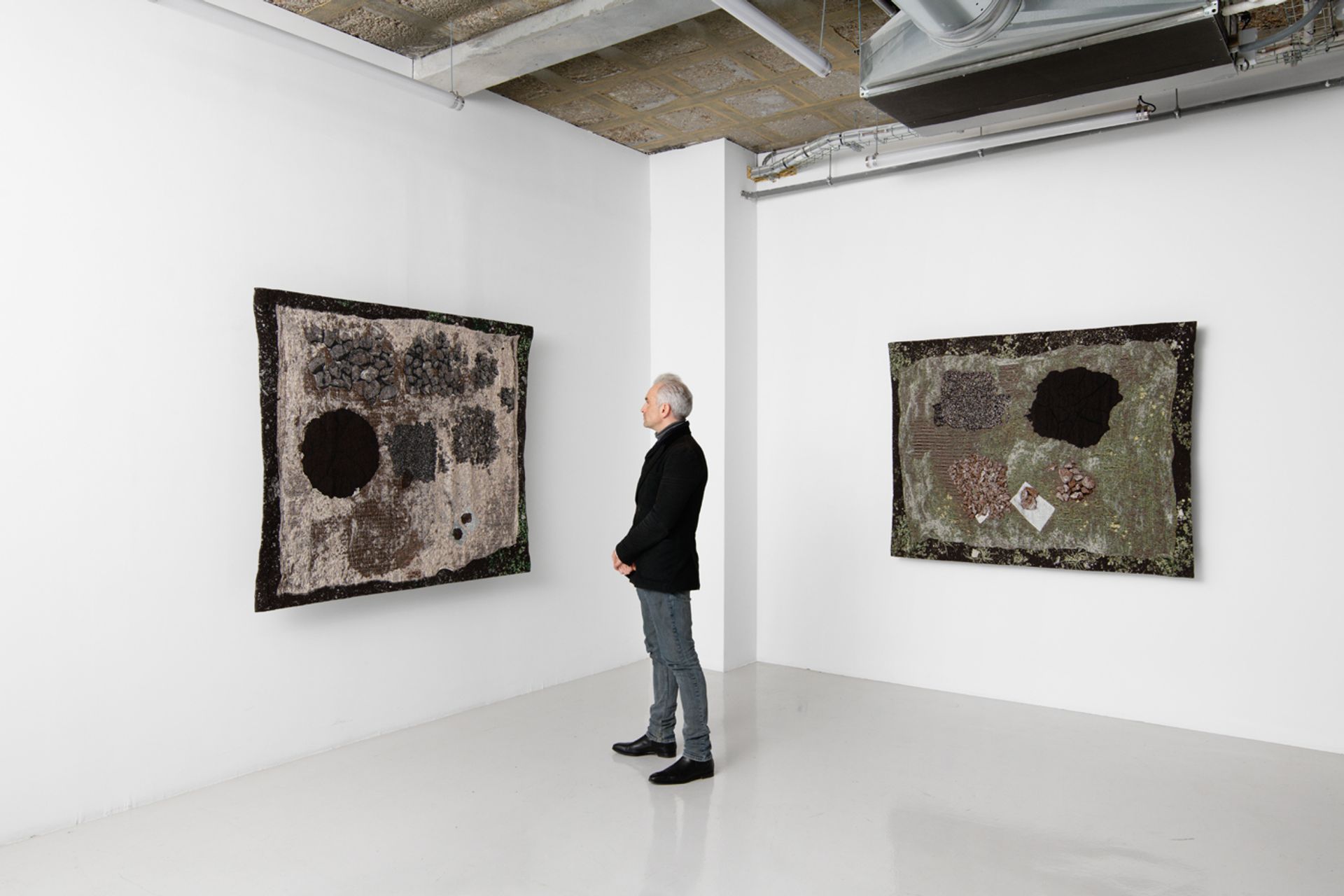 Joana Hadjithomas et Khalil Joreige avaient, il y a quelques années, entrepris une série de photographies sur des relevés de terrains pratiqués par des archéologues. Le 4 août 2020, toutes les photos ont été détruites dans l’explosion du port de Beyrouth. Sur le conseil d’Etel Adnan, ils ont entrepris de reconstruire ou reconstituer les images perdues sous la forme de tapisseries. Ces tapisseries quasi abstraites aux surprenantes textures sont emblématiques d’une œuvre travaillée par les images absentes et les mémoires occultées. Elles témoignent d’une idée de l’art comme forme de résilience et, comme l’écrit Taddeo Reinhardt, de résistance.
