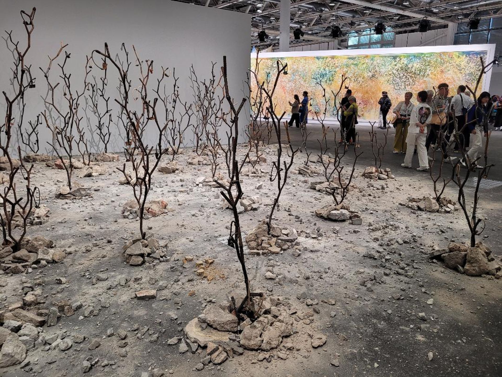 Dans le contexte actuel brûlant de la guerre Israël-Hamas, cette œuvre ancienne datant de 2016 se réfère explicitement à la Première Intifada de 1987, surnommée « Guerre des pierres », les branches en Y faisant ici écho aux lance-pierres alors utilisés. Cette installation est plus poétique que frontale pour inciter à prendre (ou pas) parti. Selon une advisor croisée sur Unlimited, de nombreux juifs américains auraient évité de voyager en Europe jusqu’à Bâle par crainte de manifestations hostiles à Israël.