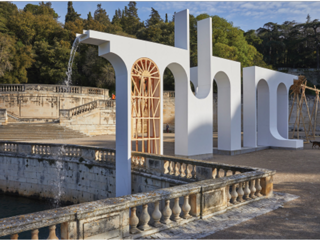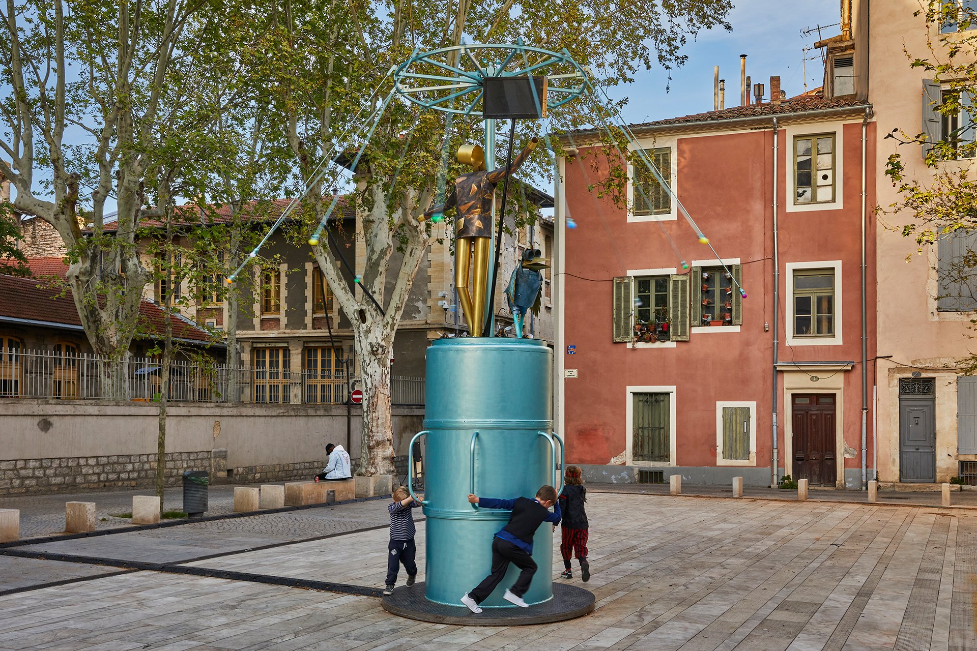 « L’idée, souligne Anna Labouze, est d’explorer les préoccupations de la jeunesse actuelle et tous les enjeux de la transmission intergénérationnelle ». Pour entériner cet aspect transgénérationnel, chaque exposition marie deux artistes, l’un « émergent », l’autre déjà établi ou historique, soit une douzaine de binômes. Si le niveau des présentations est inégal, les productions, elles, s’ancrent fortement dans la ville et son histoire, à travers des projets collaboratifs associant écoliers, étudiants ou apprentis-compagnons. À commencer par la splendide installation Water Lines déployée dans les Jardins de la Fontaine par l’architecte Feda Wardak et l’artiste Tadashi Kawamata, deux « lignes aquatiques » en lévitation dans ce populaire parc nîmois, souvenirs de la construction du Pont du Gard par les Romains et de la mystérieuse source sacrée Nemausus qui donna son nom à la ville. Idem sur la Place du Chapitre, où Caroline Mesquita et Laure Prouvost ont « sculpté », avec les enfants de la maternelle adjacente, un manège joyeux et interactif (Bee Be Mon Manège) qui, lorsqu’il est activé, donne vie aux personnages en laiton patiné qui l’habitent.