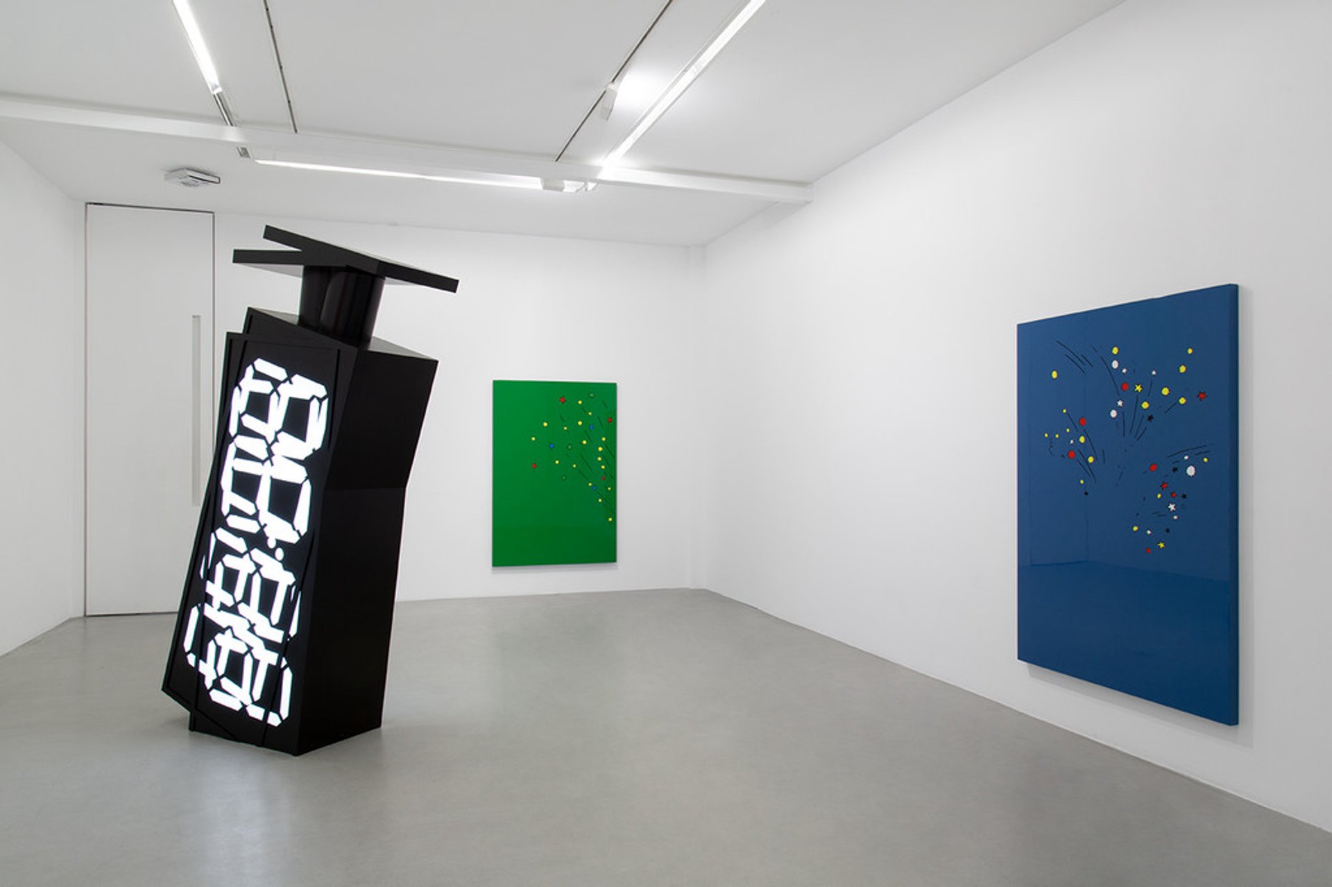 Trois tableaux portent en blanc sur fond noir un nom de ville ou un thème : Basel, Nice, Sunset. Ce sont des titres-index tracés sur des diapositives par le père de l’artiste dans les années 1960. Trois tableaux, un rouge, un bleu, un vert à la peinture de carrosserie, reproduisent des « marques d’action » empruntées à Tintin. Trois reliefs en acier inoxydable sont les empreintes de trois portes vues à Londres, New York et Paris et où se mêlent signes d’interdiction et tags. On reconnaît des stratégies propres au pop ou à l’art conceptuel actualisées avec un trait d’ironie. C’est, derrière le refus de l’image, la biographie qui s’impose avec l’écriture du père ou c’est la poétique de la ville qui disparaît sous le clinquant de l’inox. La marionnette animée d’un Gander somnolent contre un sac-poubelle sert de note en bas de page.